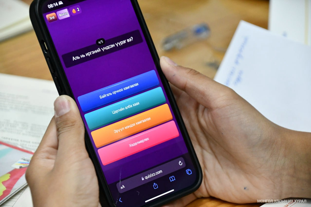 Хичээлийн төгсгөлд М.Атарбаян багш “Kahoot it” интерактив тоглоомын платформ дээр “Анхдугаар Үндсэн хуулийн мөн чанар, агуулга, ач холбогдол” сэдэвт хичээлийн хэн сайн ойлгосон талаарх уралдаан зохион байгуулж, ялагчийг тодруулаад “Монгол Улсын Үндсэн хууль” бяцхан номоо хичээлийн дэвтэртээ хавсаргахыг даалгавар болгов.