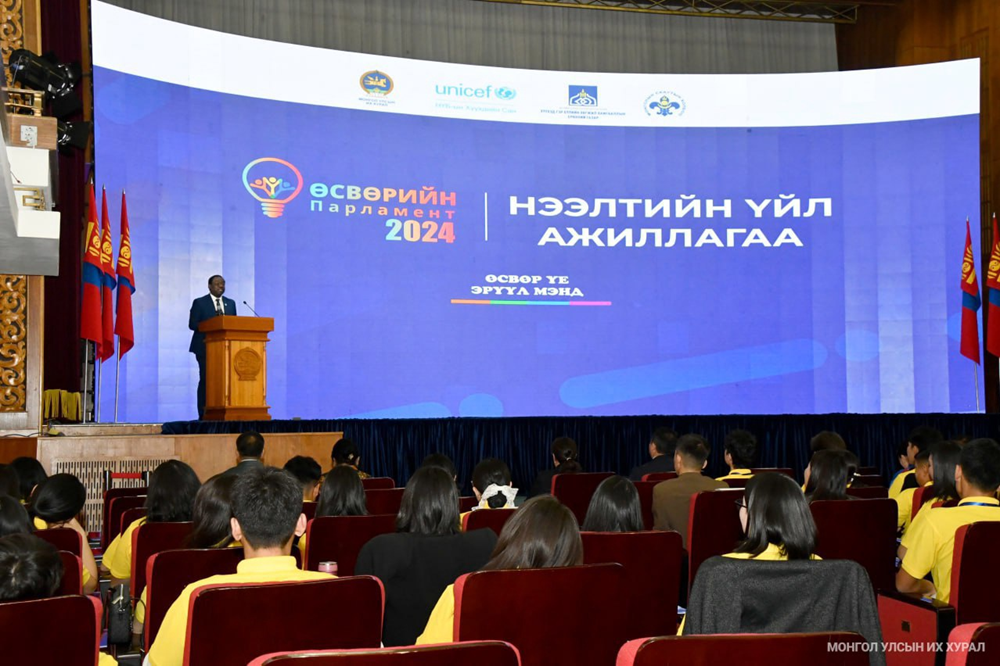 НҮБХС-гийн Монгол дахь суурин төлөөлөгч, ноён Эваристе Коуасси-Комлан “Өсвөрийн Парламент-2024″-ийн оролцогчдод амжилт хүсэж үг хэлэв. Тэрбээр, хүүхдийн эрхийн тухай товч дурдаж, эсэн мэнд амьдрах, хөгжих, хамгаалуулах болон оролцооны эрхүүд бүгд өөр хоорондоо уялдаатай, харилцан нөхцөлдөж байдгийг тайлбарлан ярьсан юм. НҮБХС-гаас хүүхдүүдийн сурах орчны эрүүл ахуйн талаар манай улсын төр, засагтай хамтран олон арга хэмжээ авч хэрэгжүүлж буйг дурдан, 6-17 насныхны дунд хүний стрептококын халдварын эрт илрүүлэг явуулж, илэрсэн тохиолдолд эмчилгээнд дэмжлэг үзүүлэх, сахуу, татрангийн болон 11 настай хүүхдүүдэд хийх хүний папиллома вирусын вакцинжуулалтыг дэмжих, сурагчдад эрүүл хооллолтыг сурталчлах аян, 6-18 насны сурагчдын эрүүл мэндийн дэвтрийг нэвтрүүлэх зэрэг ажлуудыг товч танилцуулав. Мөн тус сангийн дэмжлэгтэйгээр “Охидын булан”, “Охидын өрөө” санаачилгыг өрнүүлж, улсын хэмжээнд нийт 170 сургууль, дотуур байранд сарын тэмдгийн эрүүл мэндийн хөтөлбөр хэрэгжүүлсэн байна. Түүнчлэн хүүхдүүдийн суралцахуйг дэмжиж ажилладаг багш, сургуулийн ажилтнуудын эрүүл мэндийн боловсрол, мэдлэгийг нэмэгдүүлэхэд анхаарч буйгаа суурин төлөөлөгч танилцуулгадаа дурдлаа.