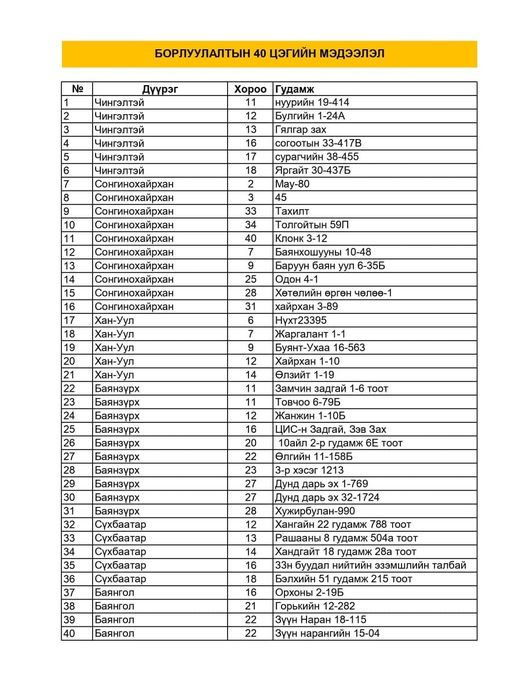 Аравдугаар сар өмнөх жилүүдээс эрс хүйтрэх төлөвтэй байгаа аж. Иймд цаг агаар хүйтэрч байгаатай холбоотойгоор шахмал түлшний борлуулалтын цэгүүд дүүрэг бүрд ажиллаж эхэллээ. Эхний ээлжид дараах 40 цэгт шахмал түлш борлуулагдахаар болжээ. Харин аравдугаар сарын 1-ээс сайжруулсан түлшний борлуулалтын цэгийг 600 бслэлолж нэмэгдэнэ. Иймд иргэд та бүхэн дараах 40 цэгээс шахмал түлшээ худалдан авах боломжтой.