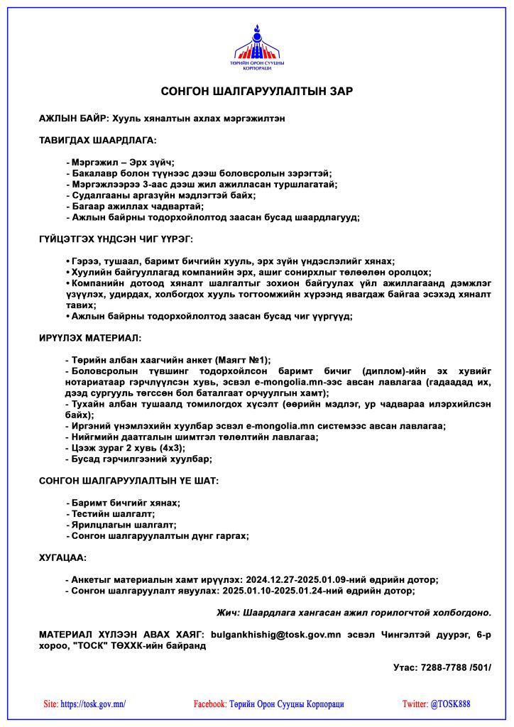 Хууль хяналтын ахлах мэргэжилтний сонгон шалгаруулалтад урьж байна