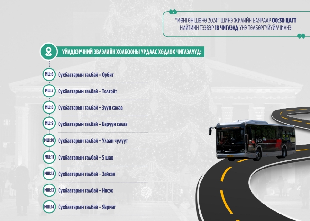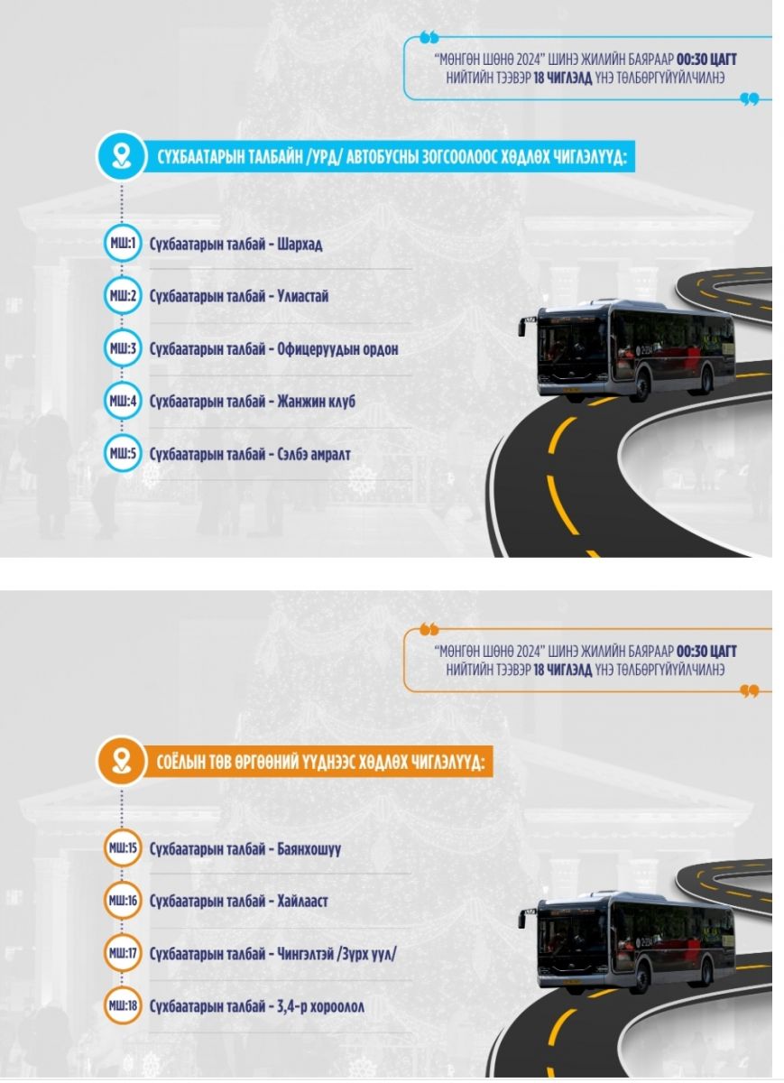 Түүнчлэн “Улаанбаатарын мөнгөн шөнө-2024” баярын тоглолт, шинэ жилийн баярын үйл ажиллагааны дараа 18 их багтаамжийн автобус Д.Сүхбаатарын талбайн баруун, зүүн болон урд зогсоолуудаас 18 чиглэлд Шархад, Офицеруудын ордон, Жанжин клуб, Улиастай, Сэлбэ амралт, Толгойт, Улаанчулуут, Орбит, Зүүн салаа, Баруун салаа, 5 шар, Зайсан, Нисэх, Яармаг, 3,4 хороолол, Хайлааст, Чингэлтэй /Зүрх уул/, Баянхошуу чиглэлд үнэ төлбөргүй үйлчилнэ.