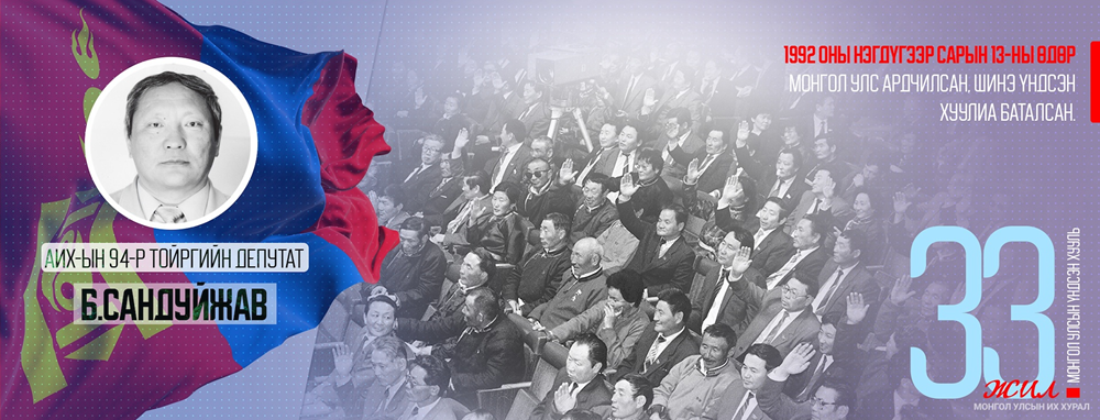 Монгол Улсын шинэ Үндсэн хууль батлагдсаны 33 жилийн ой энэ жил тохиож байгаа билээ. Энэ хүрээнд анхны ардчилсан сонгуулиар байгуулагдсан 430 депутаттай Ардын Их Хуралд сонгогдон ажиллаж, Монгол Улсын Үндсэн хуулийн эхийг барилцсан эрхмүүдийн талаарх “Ардчилсан Үндсэн хууль тогтоогчид” номд нийтэлсэн дурсамжуудаас цувралаар хүргэж байна.