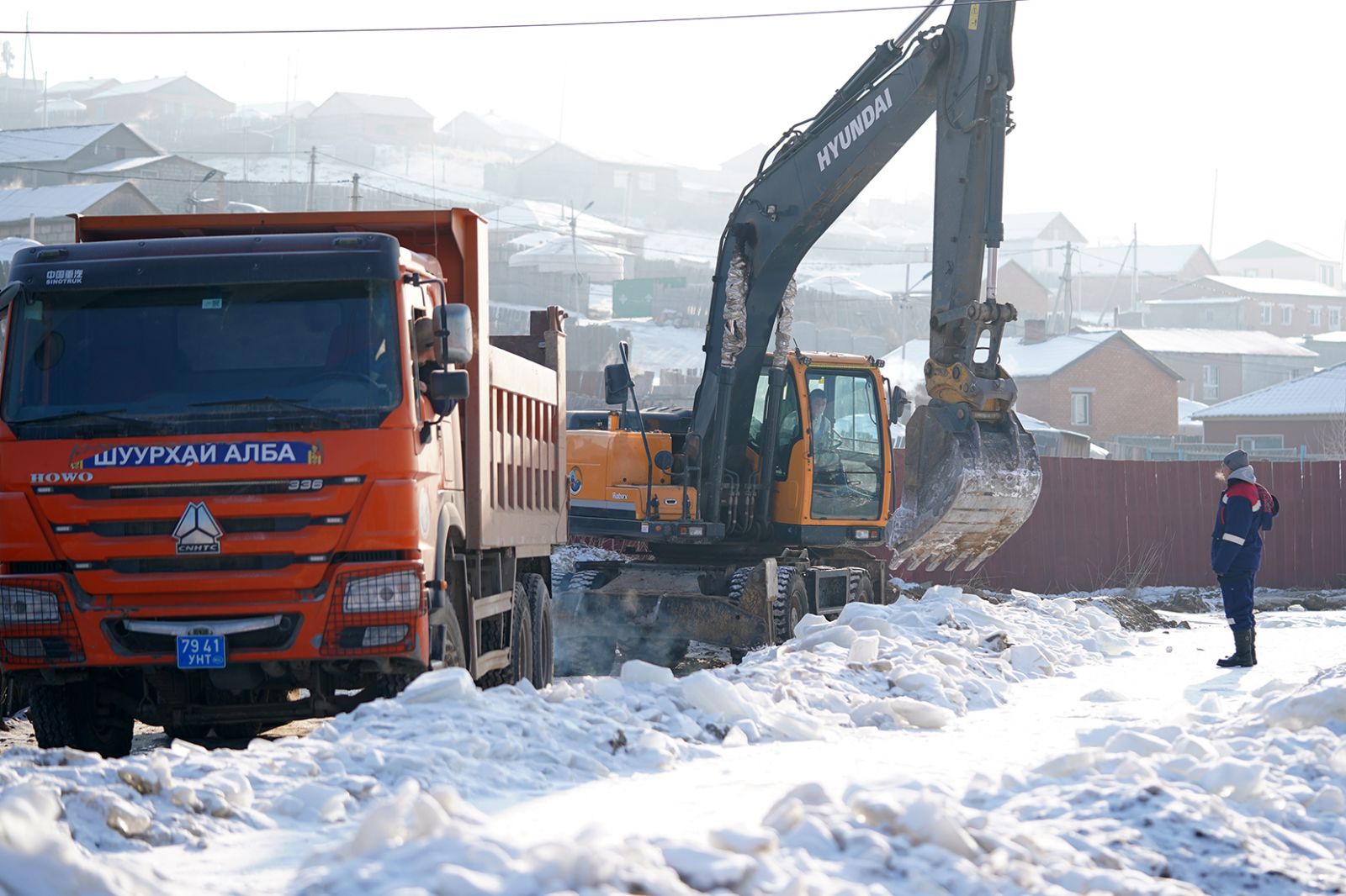 Геодези, усны барилга, байгууламжийн газар ОНӨААТҮГ-ын Ашиглалтын инженер Д.Ариунбаатар “Манай байгууллагаас үерийн хамгаалалтын барилга, байгууламжтай нийт 14 байршилд халиа тошин халих эрсдэлээс сэргийлж ажиллаж байна. Нэмэлтээр нөхцөл байдал хүндэрсэн байршлуудад мэргэжил, арга зүйн зөвлөгөө өгч ажиллаж байна. Тухайлбал, өчигдөр буюу нэгдүгээр сарын 7-нд Сонгинохайрхан дүүргийн 9 дүгээр хороонд ажилласан. Харин өнөөдөр тус дүүргийн 35 хороонд нийт 20 гаруй хүний бүрэлдэхүүнтэйгээр зургаан автомашин механизмтай ажиллаж 1 км суваг татах, илүүдэл мөс тээвэрлэх зэрэг ажлыг хийж буй” гэв.