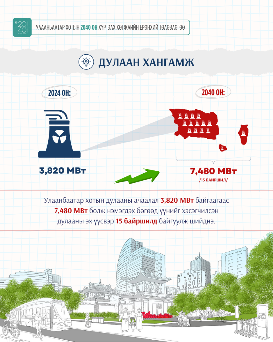 - Улаанбаатар бүсийн цахилгааны эх үүсвэр 1,169 МВт байгаа бол 2040 онд 5,408 МВт болж нэмэгдэнэ. Өсөн нэмэгдэх цахилгаан эрчим хүчний хэрэглээний 30 хувийг сэргээгдэх эрчим хүчний эх үүсвэрээс, үлдсэн хувийг дулааны цахилгаан станцаас хангана.