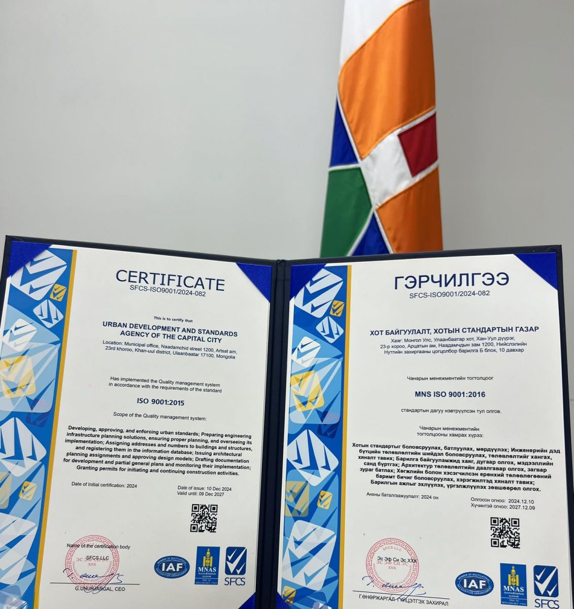 Энэ хүрээнд 2024 оны 11 дүгээр сард олон улсын стандарт, баталгаажуулалтын итгэмжлэгдсэн байгууллага болох “SFCS” ХХК-иар анхан шатны аудит болон хоёр дах шатны аудит хийлгэн, үр дүнг баталгаажуулалтын зөвлөлийн хурлаар хэлэлцүүлж, баталгаажуулалтын гэрчилгээг хүлээн авах болзлоо хангасан юм. Ийнхүү Хот байгуулалт, хотын стандартын газар нь 12 дугаар сарын 17-ны өдөр нийслэлийн нутгийн захиргааны хэрэгжүүлэгч байгууллагуудаас анхны “MNS ISO 9001:2016” чанарын менежментийн тогтолцоо стандартыг бүх үйл ажиллагаандаа нэвтрүүлсэн байгууллага болж "Баталгаажуулалтын гэрчилгээ"-гээ гардаж авлаа. Тус олон улсын стандартыг нэвтрүүлснээр хэрэглэгч төвтэй үйл ажиллагааг байгууллагын бүхий л түвшинд хэрэгжүүлж, албан хаагч болон харилцагч байгууллага, иргэдийн сэтгэл ханамжийг дээшлүүлэхэд чиглэсэн алхмыг тодорхойлсон онцлогтой.