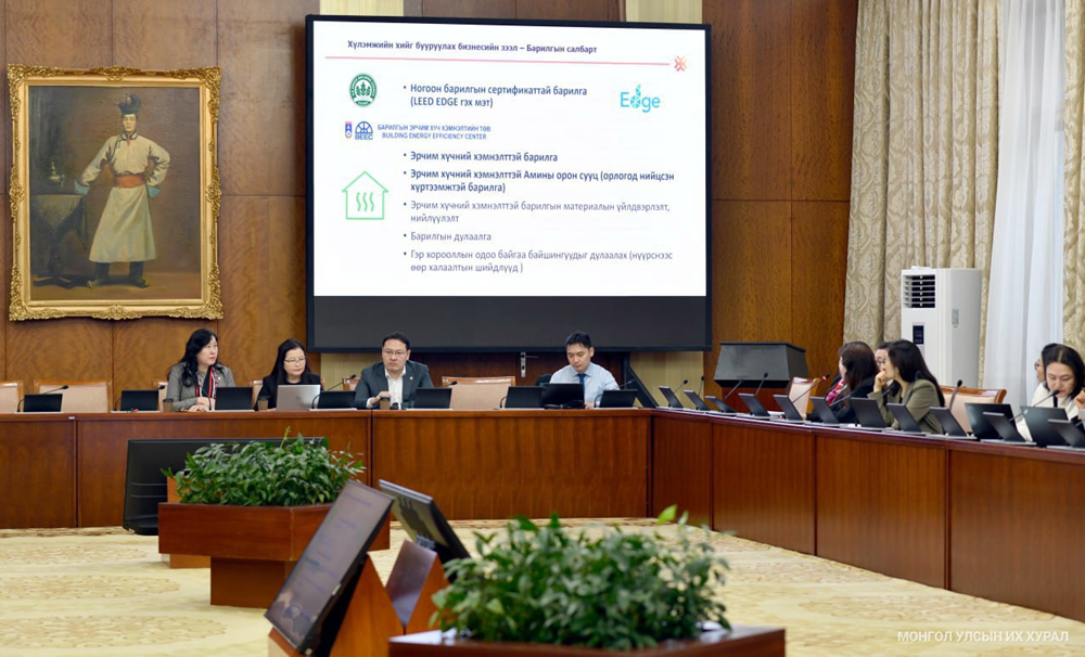 Улсын Их Хурлын даргын 2024 оны 85 дугаар захирамжаар байгуулагдсан Хот, суурин газрыг орон сууцжуулахад ногоон санхүүжилтийн тогтолцоог бүрдүүлэх, эрх зүйн орчныг сайжруулах санал, дүгнэлт гаргах, холбогдох хуулийн төсөл боловсруулах үүрэг бүхий ажлын хэсэг энэ талаарх эрх зүйн болон тогтолцооны орчин нөхцөлийг судалж, холбогдох талуудын мэдээллийг сонсох, нэгтгэх ажлыг хийж байна.