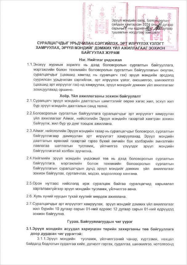 Эрүүл мэндийн сайд, Боловсролын сайдын хамтарсан тушаалаар "Суралцагчдыг урьдчилсан сэргийлэх, эрт илрүүлэх үзлэгт хамруулах, эрүүл мэндийг дэмжих үйл ажиллагааг зохион байгуулах тухай" журмыг баталлаа.