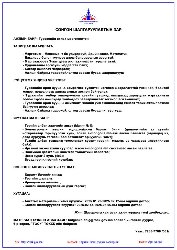 Түрээсийн ахлах мэргэжилтэн сонгон шалгаруулна.