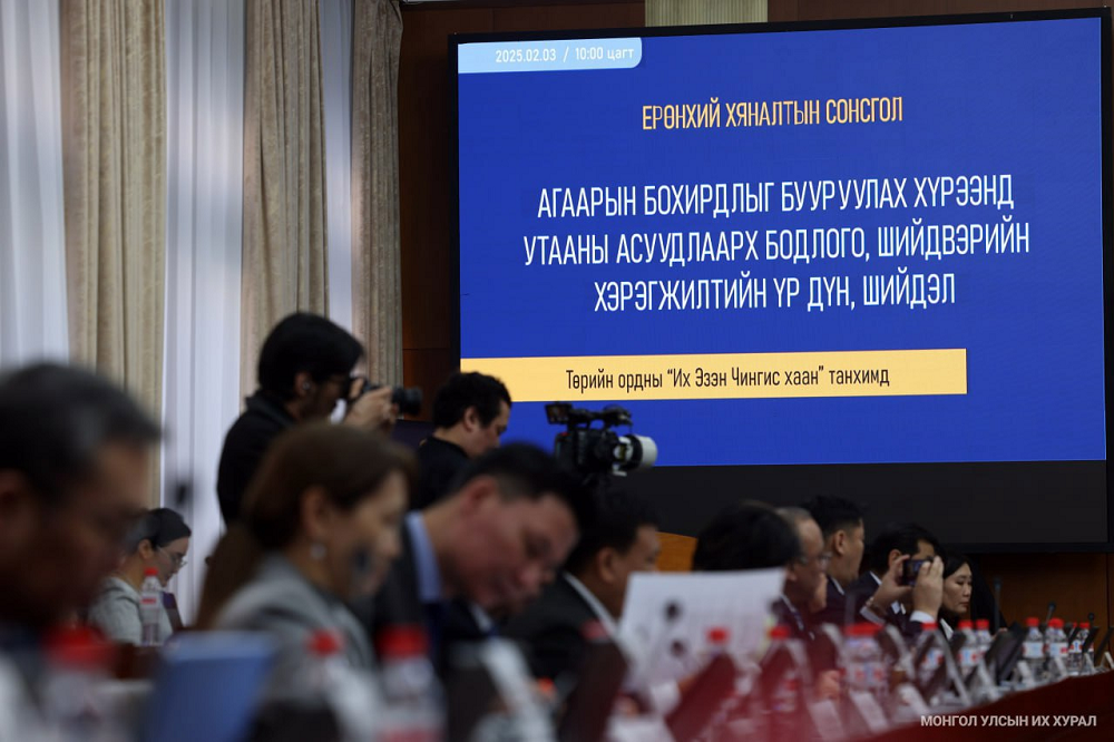 Монгол Улсын Их Хурлын Байгаль орчин, хүнс, хөдөө аж ахуйн байнгын хорооноос “Агаарын бохирдлыг бууруулах хүрээнд утааны асуудлаарх бодлого, шийдвэрийн хэрэгжилтийн үр дүн, шийдэл” ерөнхий хяналтын сонсголыг өнөөдөр /2025.02.03/ зохион байгууллаа. Ерөнхий хяналтын сонсгол гишүүдийн 54.2 хувийн ирцтэйгээр 10 цаг 22 минутад эхэлсэн бөгөөд Улсын Их Хурлын гишүүн, ажлын хэсгийн ахлагч Ж.Чинбүрэн даргалсан.