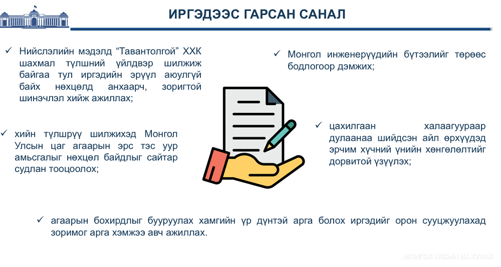 “Монгол Улсын Үндсэн хууль үндсэн эрх болон иргэний амьд явах эрүүл аюулгүй орчинд амьдрах эрхийг ноцтойгоор зөрчиж заналхийлж, үндэсний аюулгүй байдалд хүрсэн утааны асуудал нь хүний эрүүл мэндэд ямар сөрөг нөлөө үзүүлж үндэсний ирээдүй сүйрүүлж аюул болно гэдгийг эдгээр хэлэлцүүлгээр тодорхойлж байгааг онцлоод сонсголын дүгнэлтийг Улсын Их Хурлын гишүүн С.Эрдэнэболд танилцуулав.