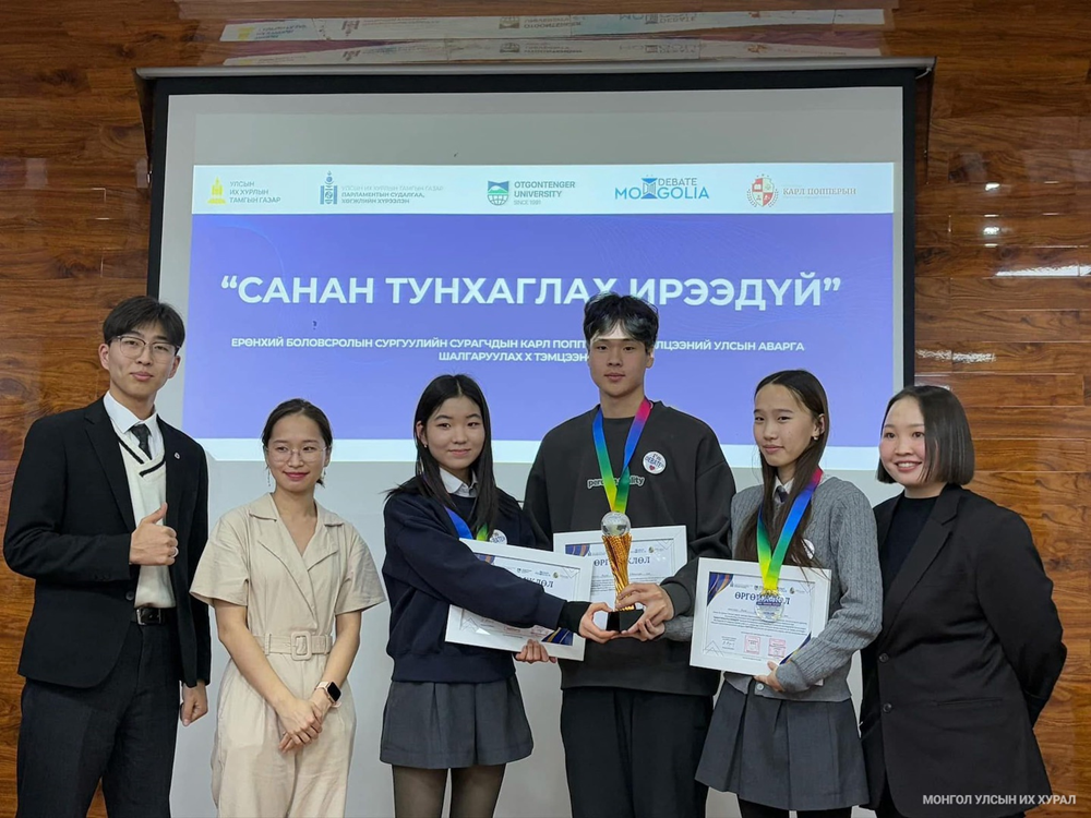 Монгол Улсын Их Хурлын Тамгын газрын Парламентын судалгаа, хөгжлийн хүрээлэн, Монголын Карл Попперын мэтгэлцээний нийгэмлэг, Отгонтэнгэр их сургууль хамтран ерөнхий боловсролын сургуулийн сурагчдын дунд зохион байгуулсан “Санан тунхаглах ирээдүй” Карл Попперын мэтгэлцээний улсын аварга шалгаруулах X тэмцээн өнөөдөр /2025.02.09/ шилдгүүдээ тодруулж, өндөрлөлөө.