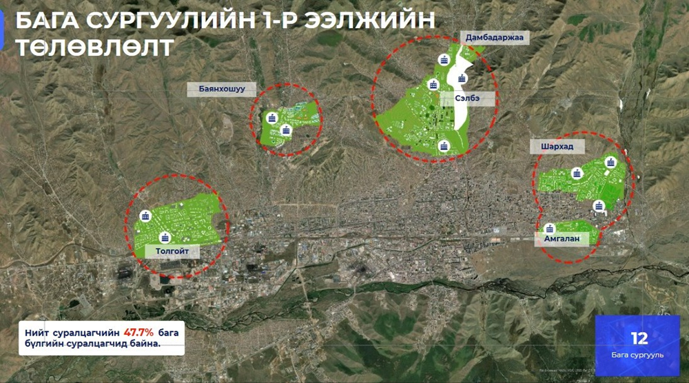 Тиймээс бага сургуулиудын хотын төв рүү төвлөрч буйг сааруулахын тулд гэр хорооллын бүсэд дэд төвүүд байгуулж, дэд төвийнхөө орчимд сургуулиуд барихаар төлөвлөсөн. Энэ нь агаарын бохирдол, замын түгжрэлийг бууруулахад бодитоор хувь нэмрээ оруулна гэж судлагджээ. Эхний ээлжид Шар хад дэд төвд дөрөв, Сэлбэ дэд төвд дөрөв, Баянхошуу дэд төвд хоёр, Толгойт дэд төвд хоёр, нийт 12 бага сургуулийг барихаар төлөвлөж байна. Хоёрдугаар ээлжид 14 бага сургуулийг бусад хүртээмжгүй байгаа хэсэгт барина. Улмаар нийт 26 сургуульд 21.840 суралцагч сурах боломж бүрдэнэ. Эдгээр бодлого шийдвэр Улаанбаатар хотын хөгжлийн ерөнхий төлөвлөгөөтэй уялдаж зохион байгуулагдах юм.