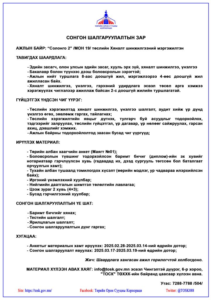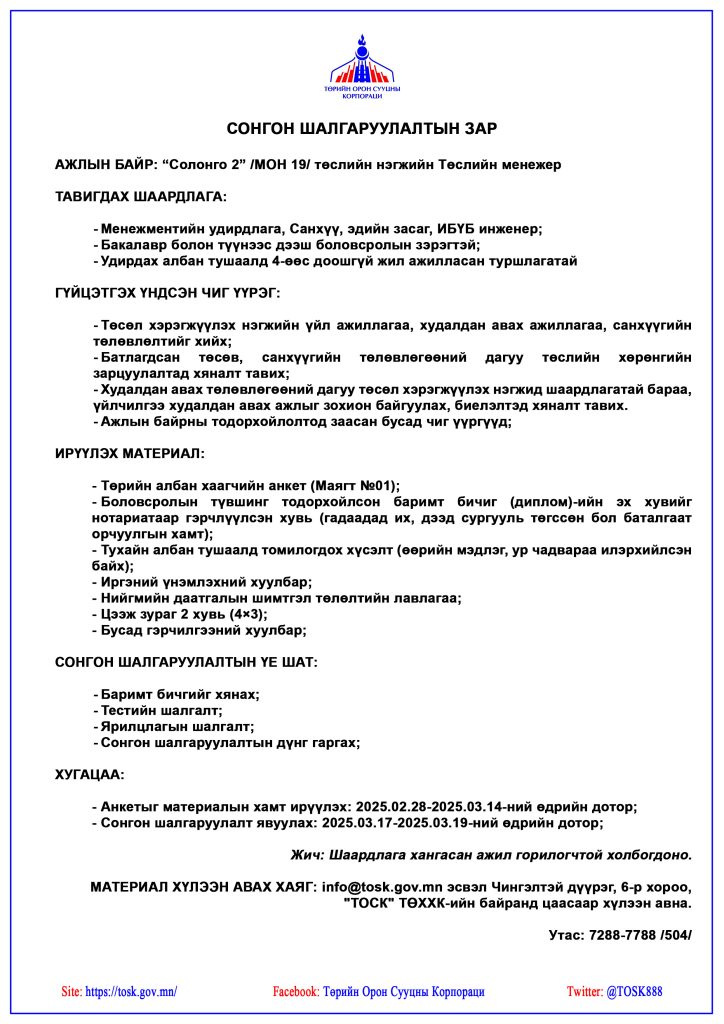Дараах ажлын байранд ажилтан сонгон шалгаруулж авнаДараах ажлын байранд ажилтан сонгон шалгаруулж авна