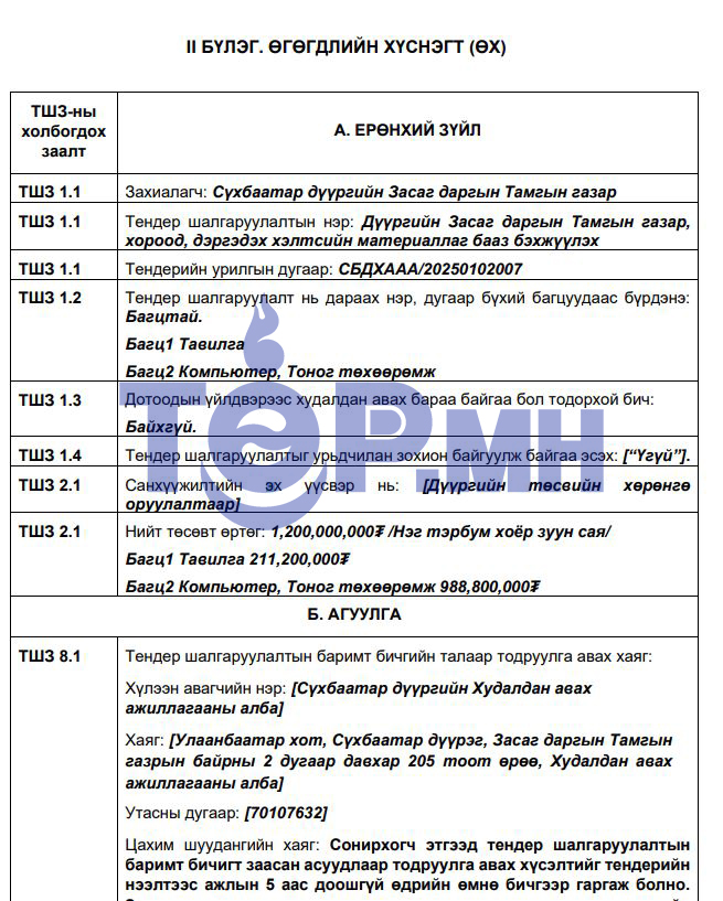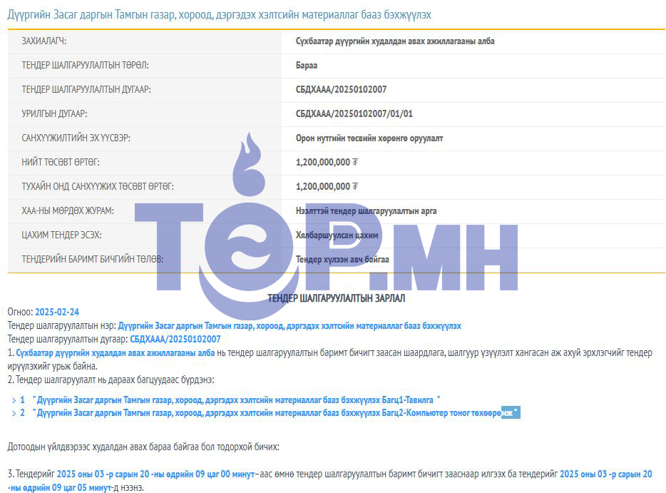 Тендерийг гуравдугаар сарын 20-ны өдрийн 09 цаг 05 минутад нээх бөгөөд 211 сая 200 мянган төгрөгөөр тавилга, 988 сая 800 мянган төгрөгөөр компьютер, тоног төхөөрөмж авахаар тендерийн бичиг баримтад тусгажээ.