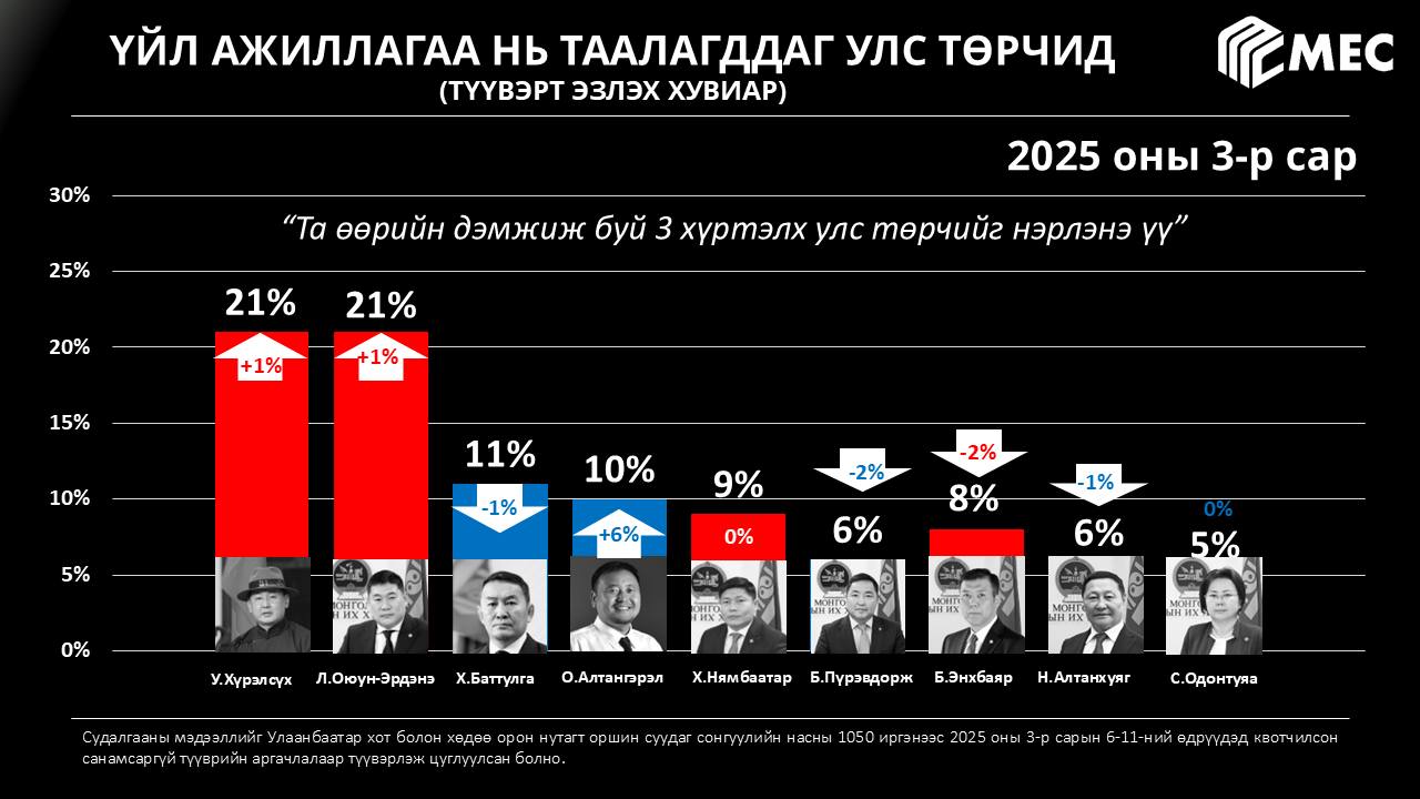 Судалгааны MEC байгууллагаас гуравдугаар сарын улс төрийн бараметрийг гаргажээ. Судалгаанд сонгуулийн насны 1050 иргэнээс квотчилсон санамсаргүй түүврийн аргачлалаар түүвэрлэн “Та өөрийн дэмжиж буй 3 хүртэлх улс төрчийг нэрлэнэ үү” гэх асуултад хариулж, улс төрийн рейтингийн өсөлт бууралтыг тодорхойлжээ.