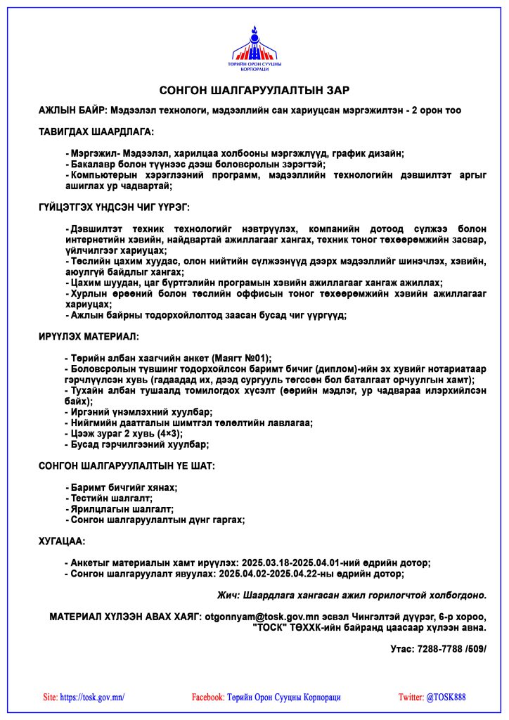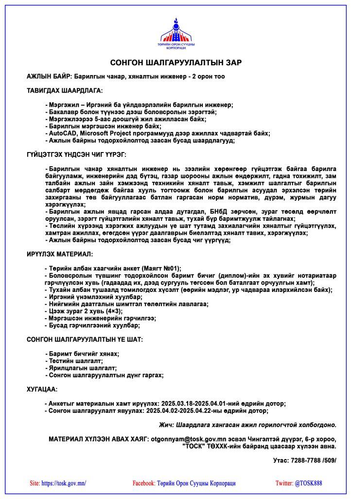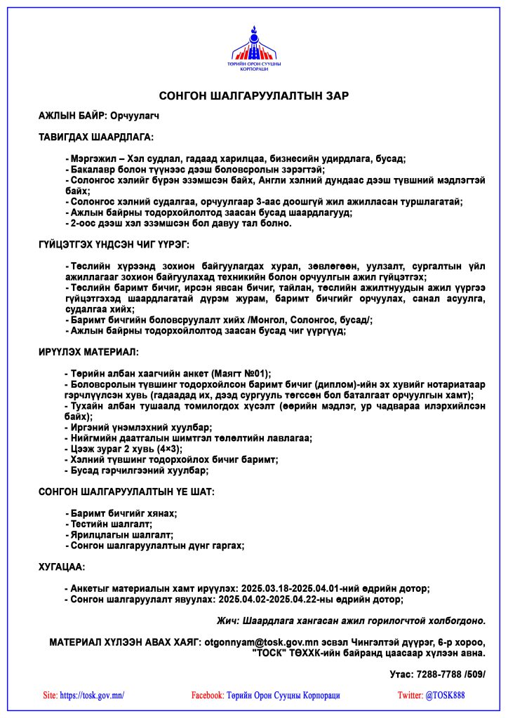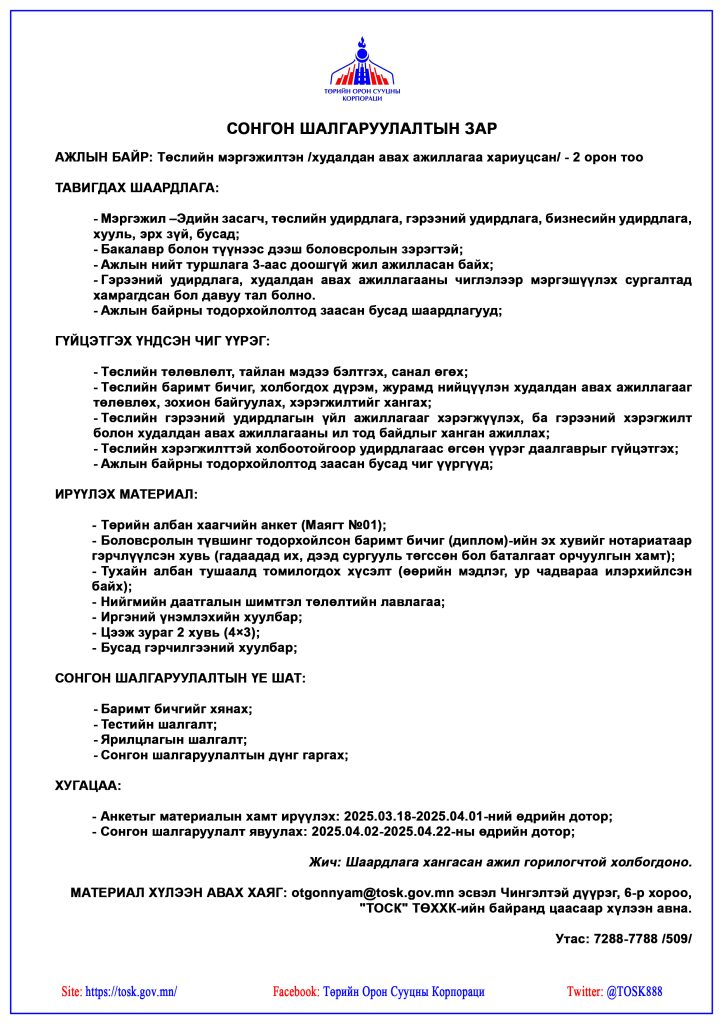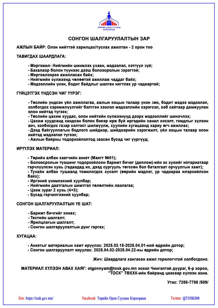 Дараах ажлын байранд ажилтан сонгон шалгаруулж авна