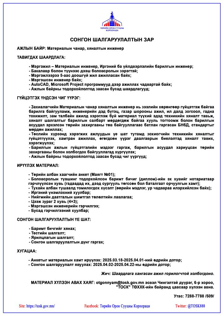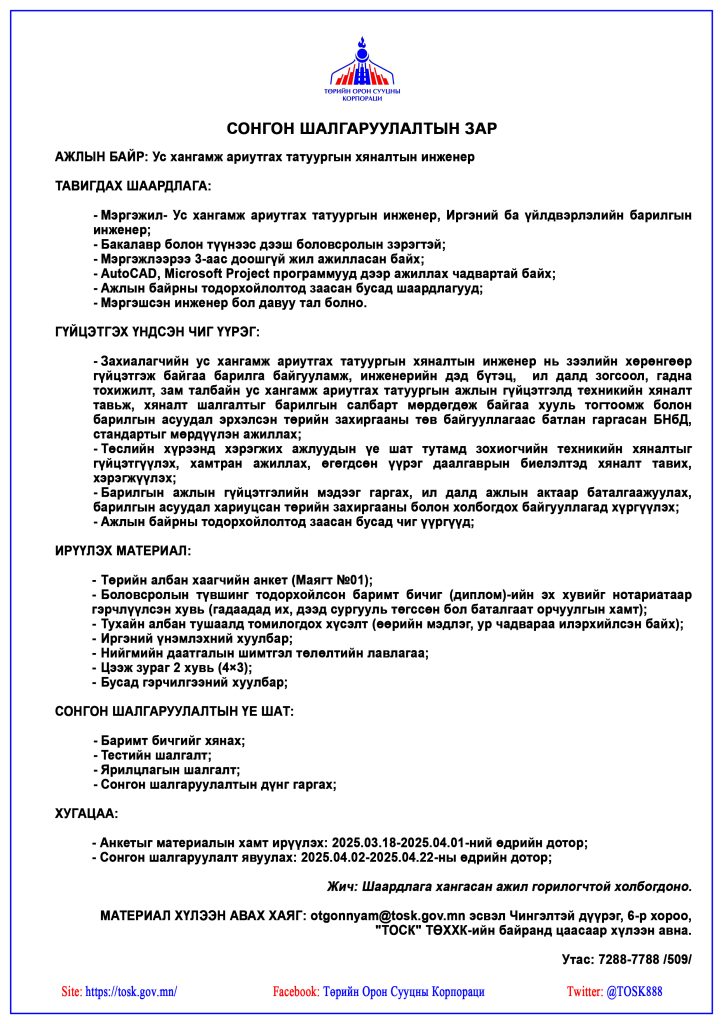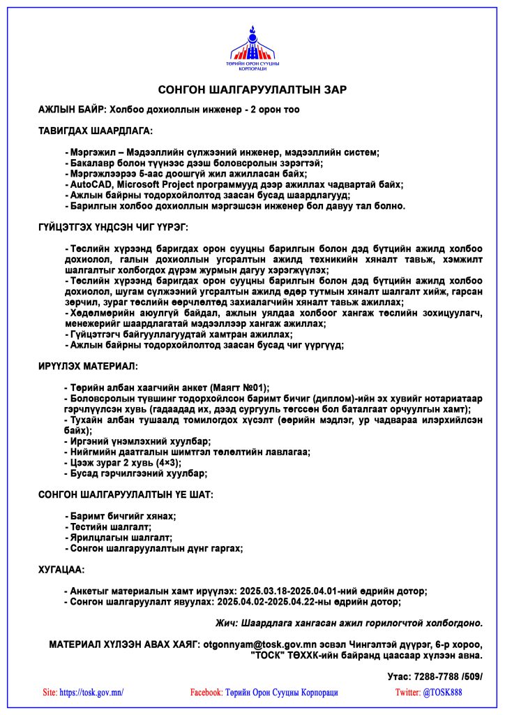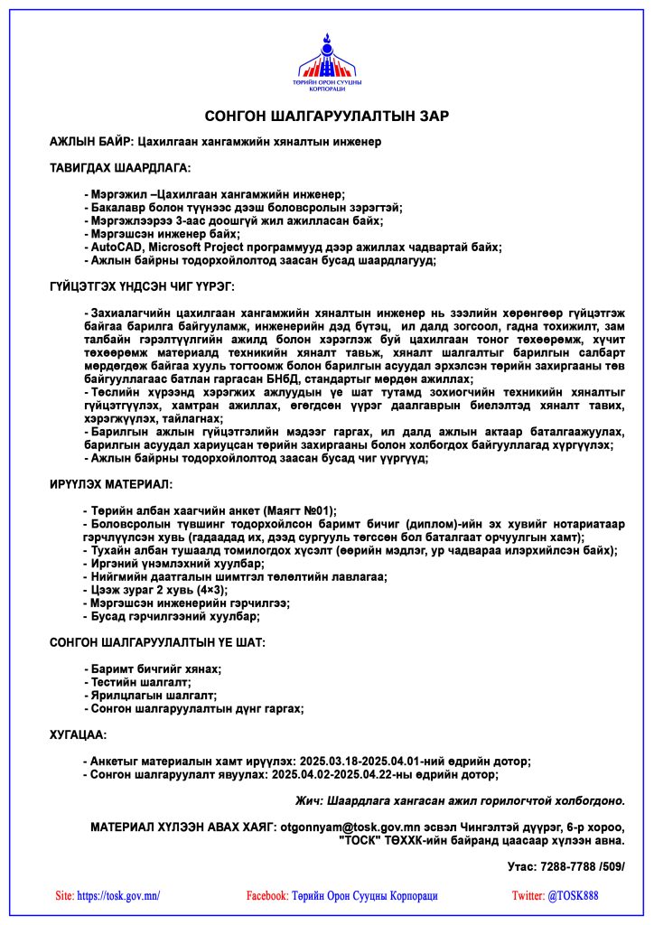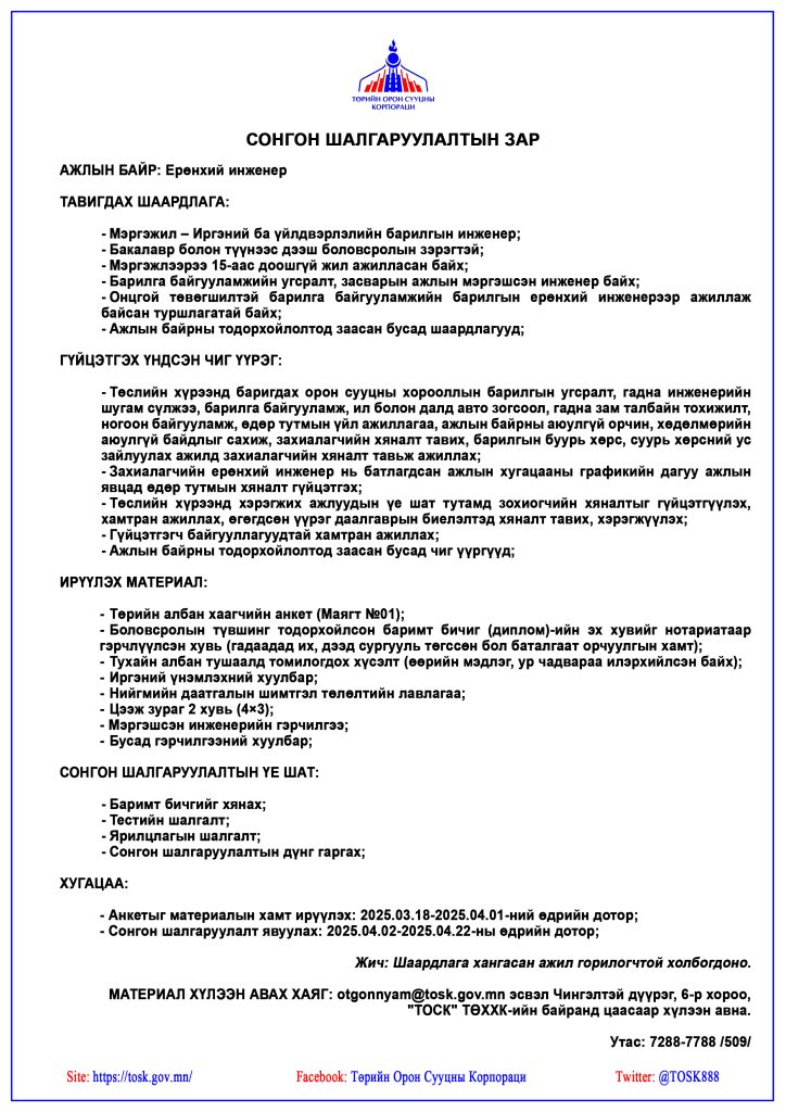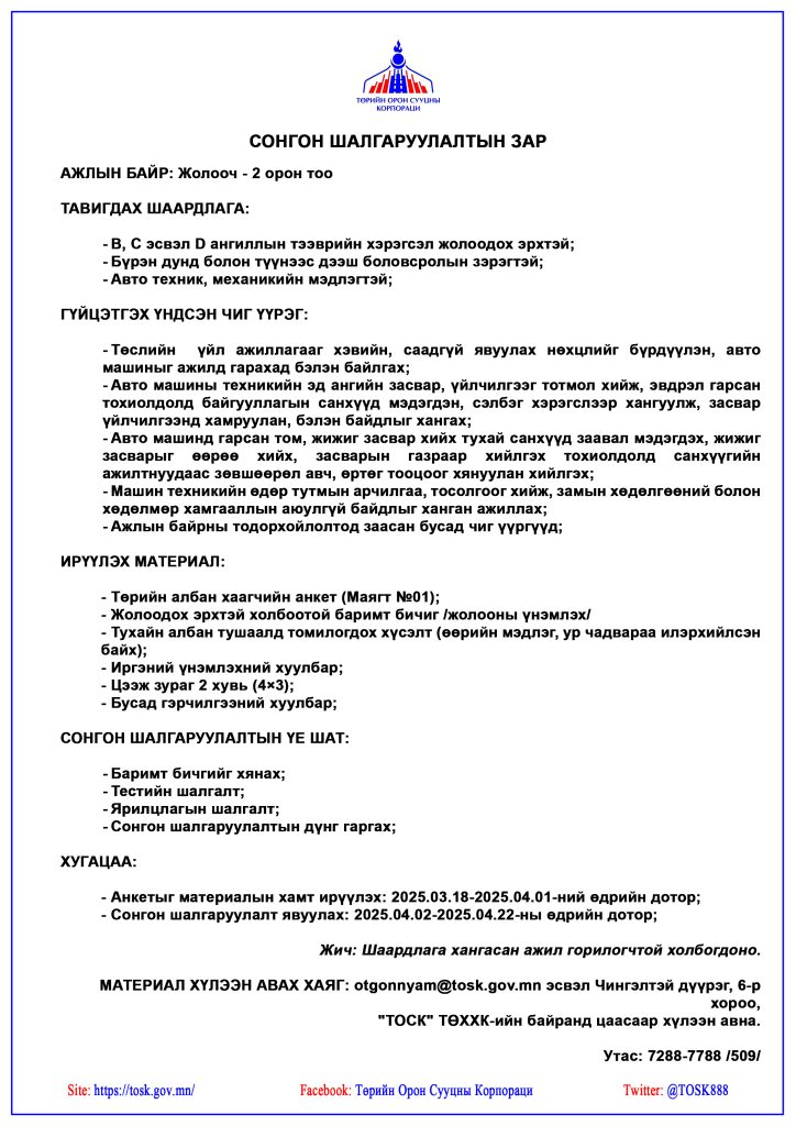 Дараах ажлын байранд ажилтан сонгон шалгаруулж авна