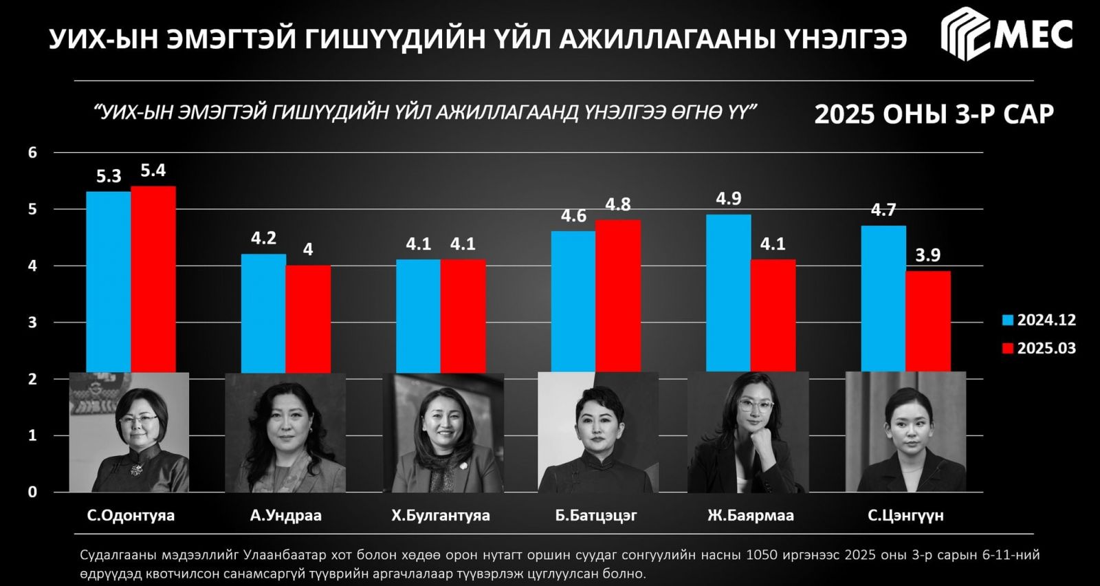 Судалгаанд оролцсон иргэд Гадаад харилцаа сайд Б.Батцэцэг, УИХ-ын дэд дарга Х.Булгантуяа, Уур, амьсгалын өөрчлөлтийн сайд С.Одонтуяа, УИХ-ын гишүүн А.Ундраа, С.Цэнгүүн, Ж.Баярмаа нарын үйл ажиллагааг үнэлж, санал өгчээ.