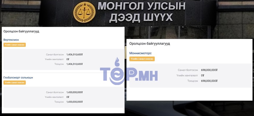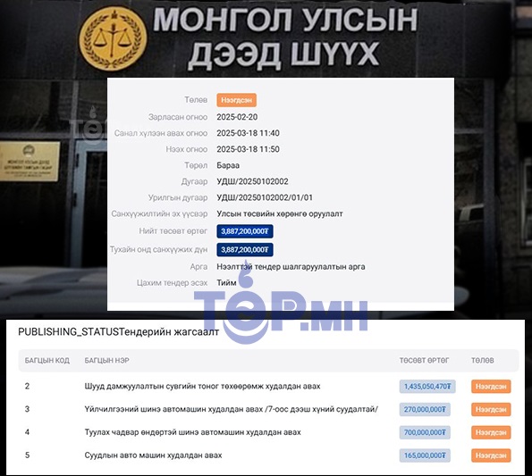 Улсын дээд шүүх 3 тэрбум 887 сая 200 мянган төгрөгийн /3,887,200,000/ нээлттэй тендер зарлажээ. Үүнд: