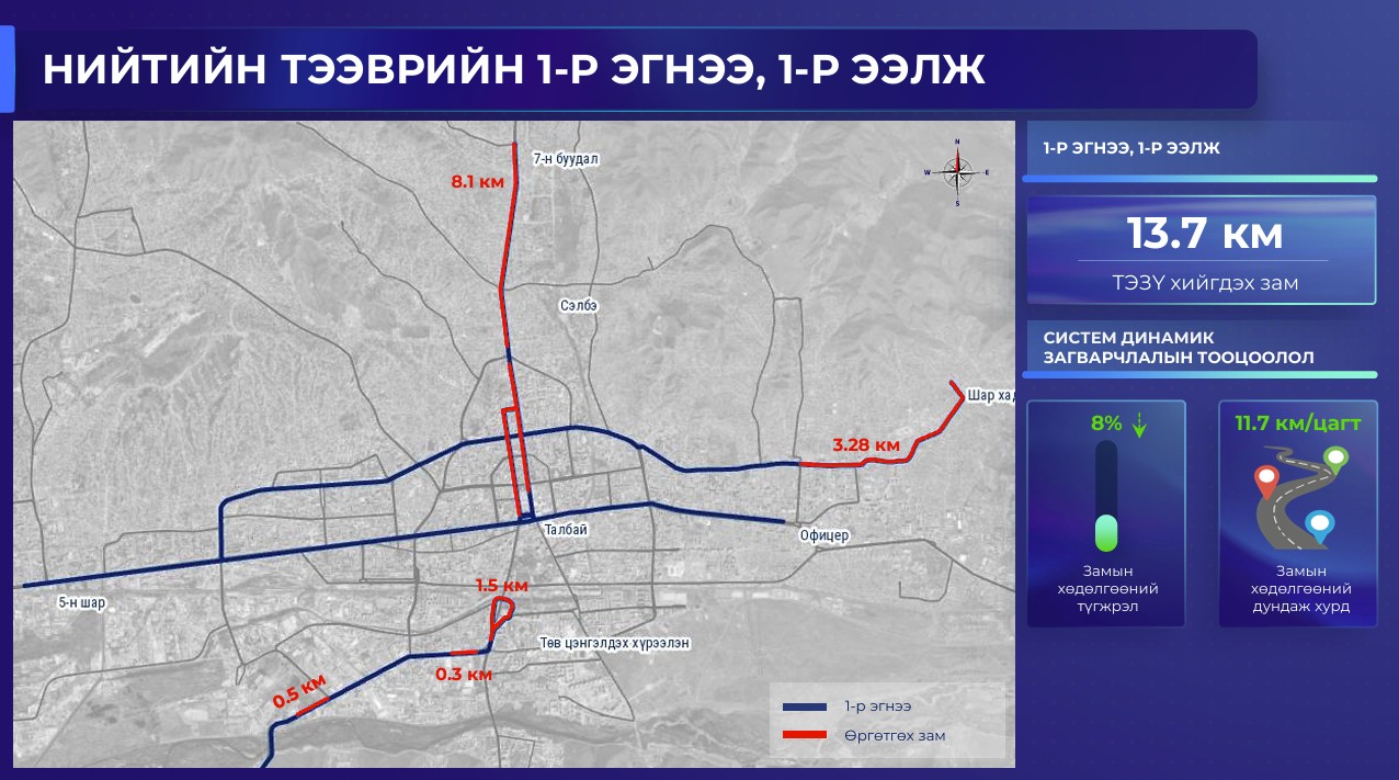 Тодруулбал, замын хөдөлгөөний ачаалал ихтэй байршлуудад нийтийн тээврийн автобусны нэгдүгээр эгнээг хоёр үе шаттай өргөтгөж, гэр хороололд нийтийн тээвэр хүртээмжгүй хэсэгт авто зам барьснаар Улаанбаатар хотын түгжрэл 31.7 хувиар буурах тооцоолол бүхий төслийг нийслэлийн Бодлогын судалгаа, шинжилгээний төвийн Эрдэмтдийн зөвлөл танилцуулав.