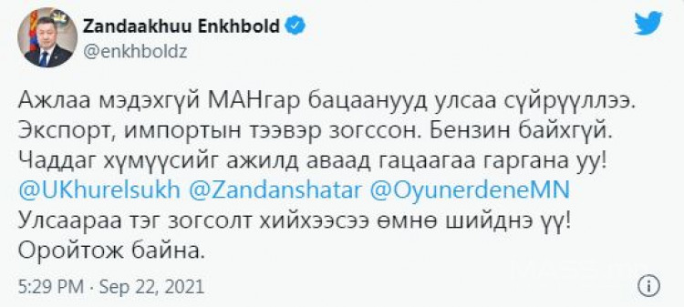 Гэвч цаг үеийн байдалтай уялдуулан З.Энхболд өөрийн цахим хуудсаараа дамжуулаад эрх баригчдыг "МАНГАР" хэмээн дуудаад амжлаа.