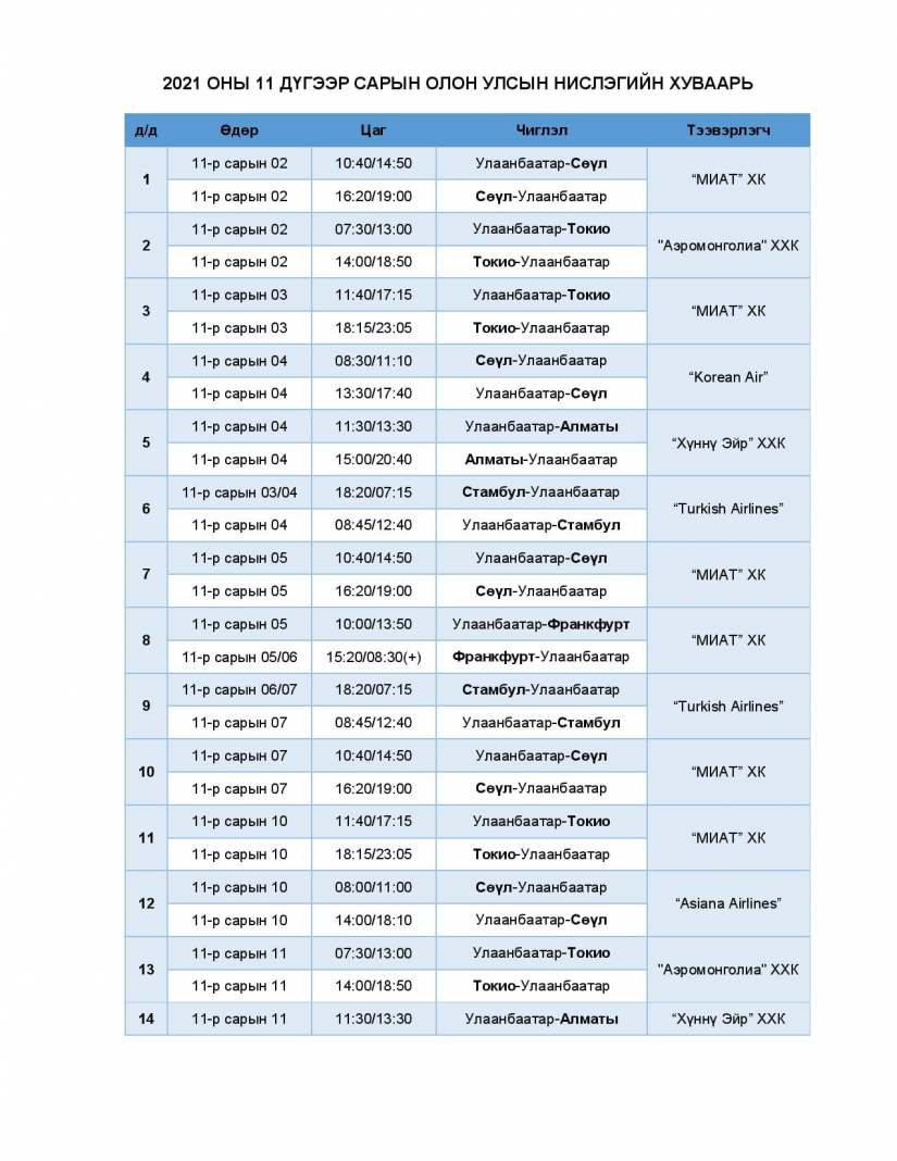 ИНЕГ-аас энэ оны сүүлийн 2 сард олон улсын 84 нислэг үйлдэгдэхээр хуваарь баталжээ. Тодруулбал, 11 дүгээр сард 39, 12 дугаар сард 45 хуваарьт нислэг үйлдэнэ. Хуваарьт нислэгээс гадна зорчигчдын хүсэлт, эрэлтийг харгалзан, агаарын тээвэрлэгчид нисэн очих улсын хилийн хориг, хязгаарлалтгүй тохиолдолд захиалгат нислэг үйлдэх боломжтой аж.