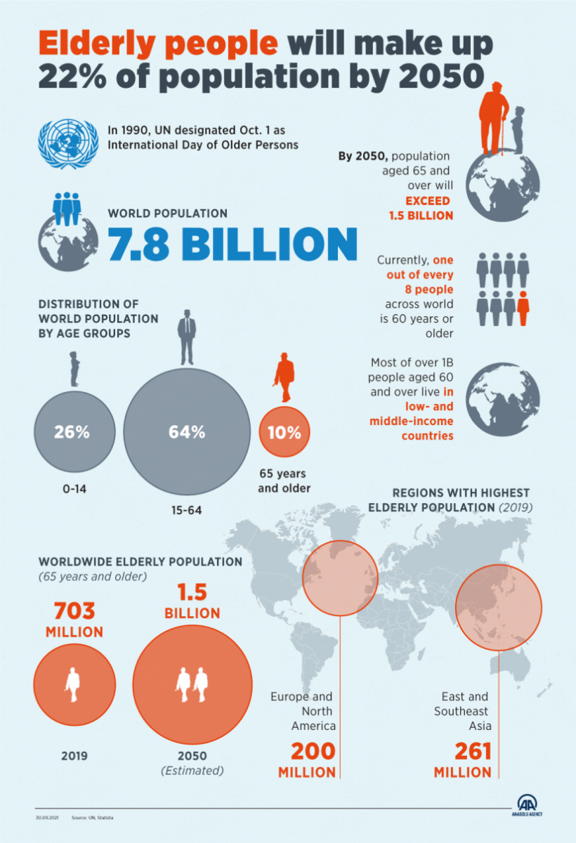 Дэлхийн ахмад настай хүн амын тоо 2050 он гэхэд одоогийнхоос хоёр дахин нэмэгдэж, 1.5 тэрбумд хүрэх төлөвтэй байна гэж НҮБ-ын Хүн амын сан мэдээлжээ.
