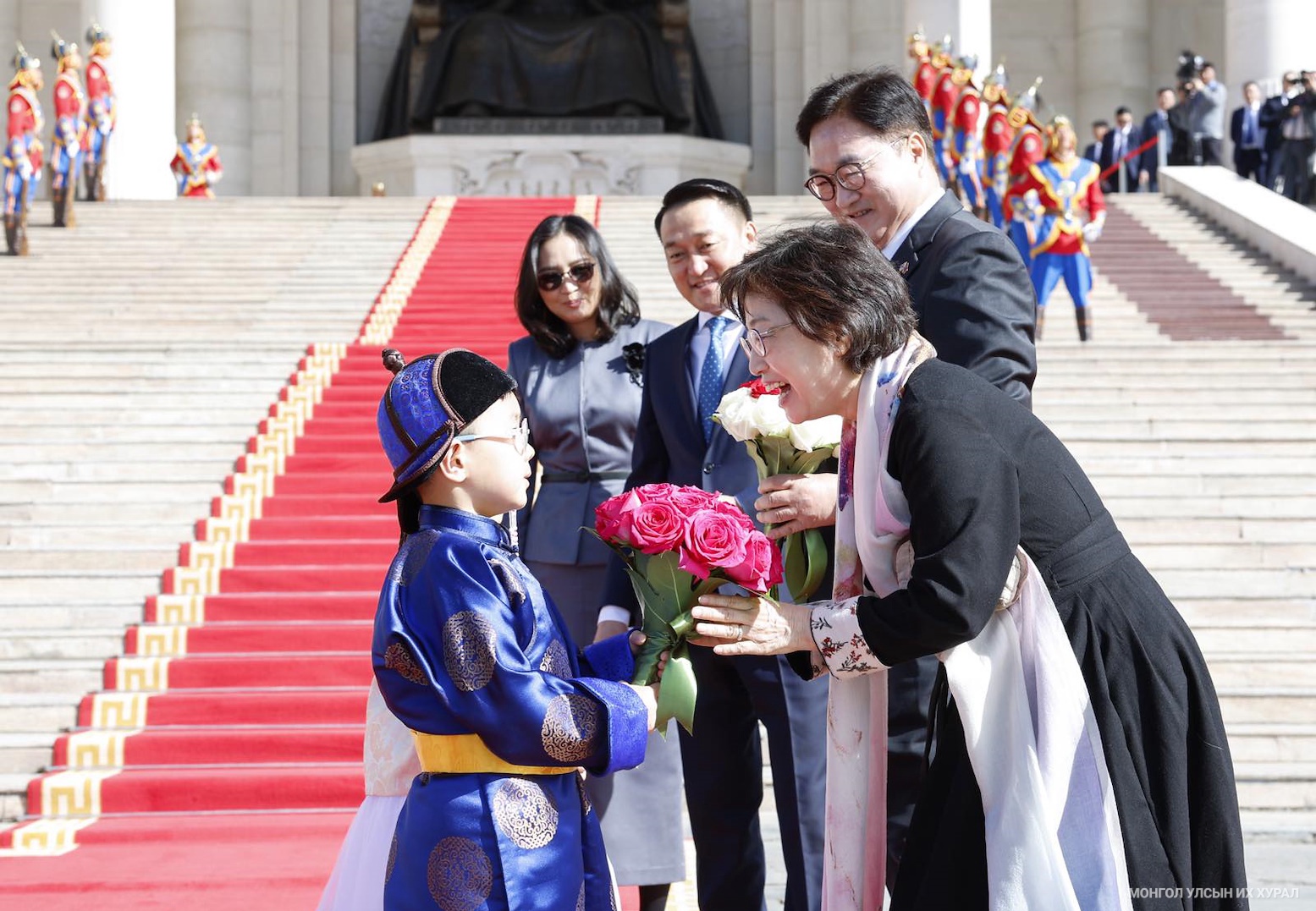 Улсын Их Хурлын дарга Д.Амарбаясгалан гэргий Д.Бямбасүрэнгийн хамтаар Монгол Улсад албан ёсны айлчлал хийж буй Бүгд Найрамдах Солонгос Улсын Үндэсний Ассамблейн дарга Ү Вон Шиг, гэргий Шин Гён Хэ нарыг өнөөдөр жанжин Д.Сүхбаатарын талбайд угтан мэндчиллээ.