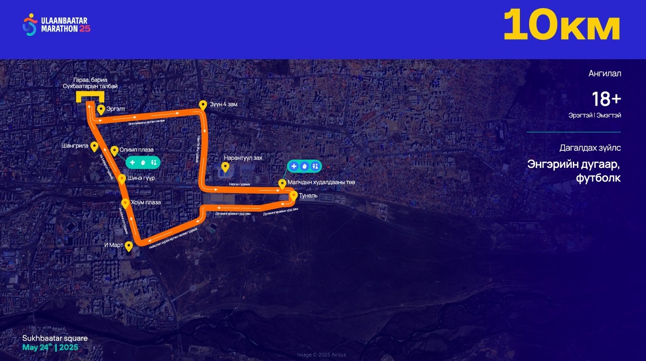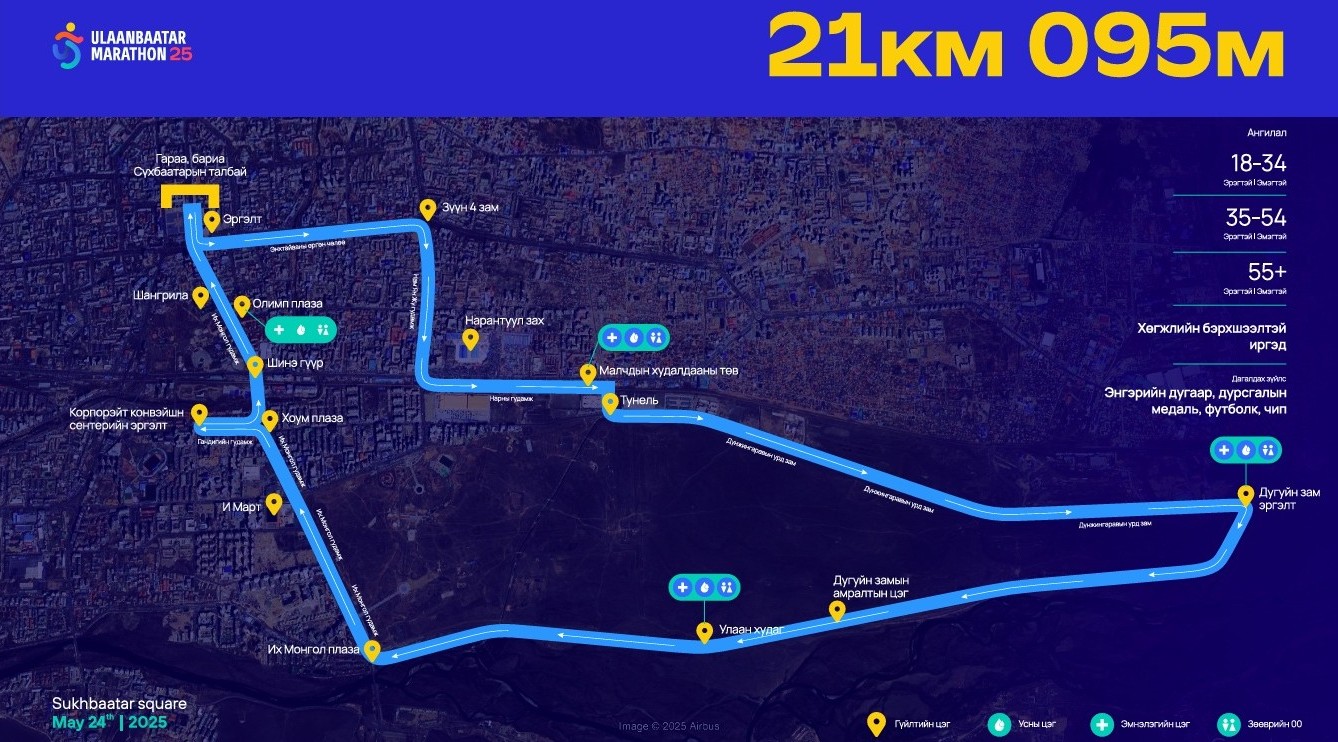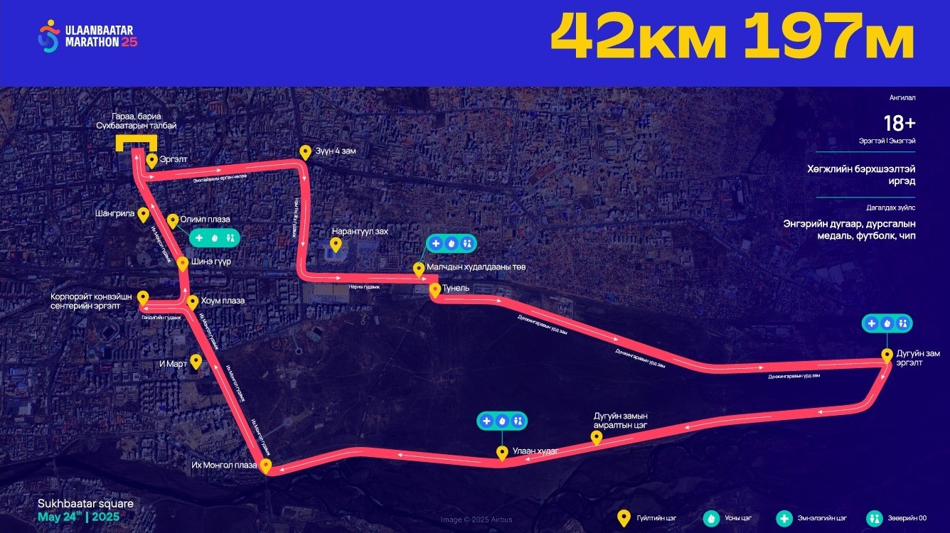 42 км-т гүйгчид 21 км-ийн зайн маршрутаар 2 бүтэн тойрог гүйнэ.