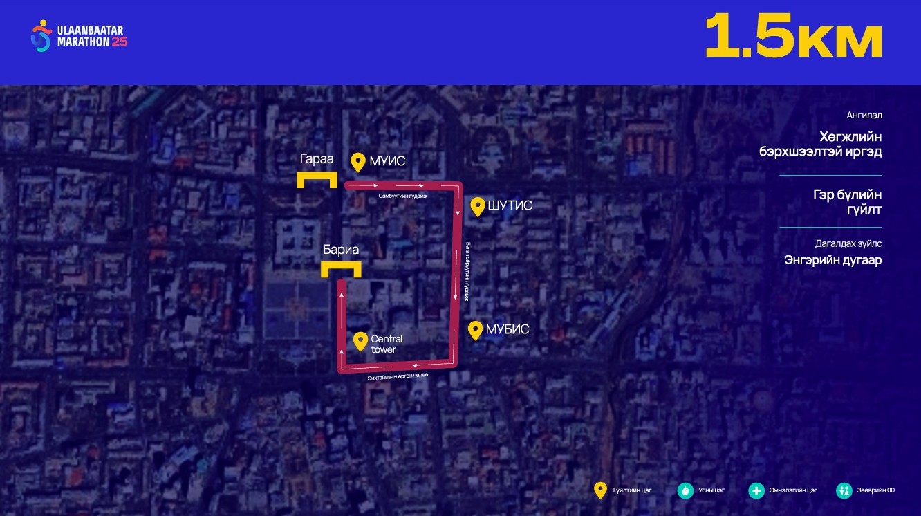 1.5 км: Гараа- МУИС- ШУТИС- МУБИС- Централ Тауэр- Соёлын төв өргөө- Бариа