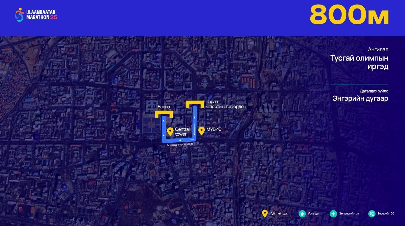 800 метр: Гараа- Спортын төв ордон- МУБИС- Энхтайваны өргөн чөлөө- Централ Тауэр - Соёлын төв өргөө- Бариа