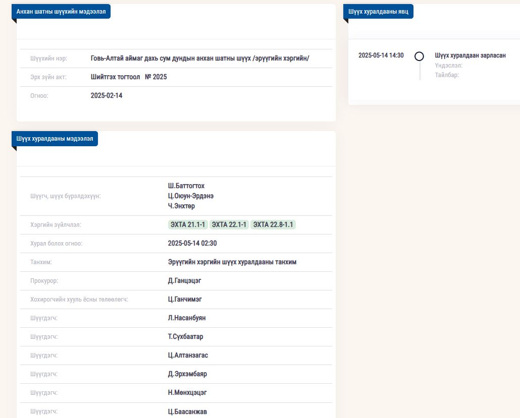 Тэгвэл дээрх хэргийн давж заалдах шатны шүүх хурал тавдугаар сарын 14-ний /2025.05.14/ өдрийн 14 цаг 30 минутад болох тов зарлагджээ.