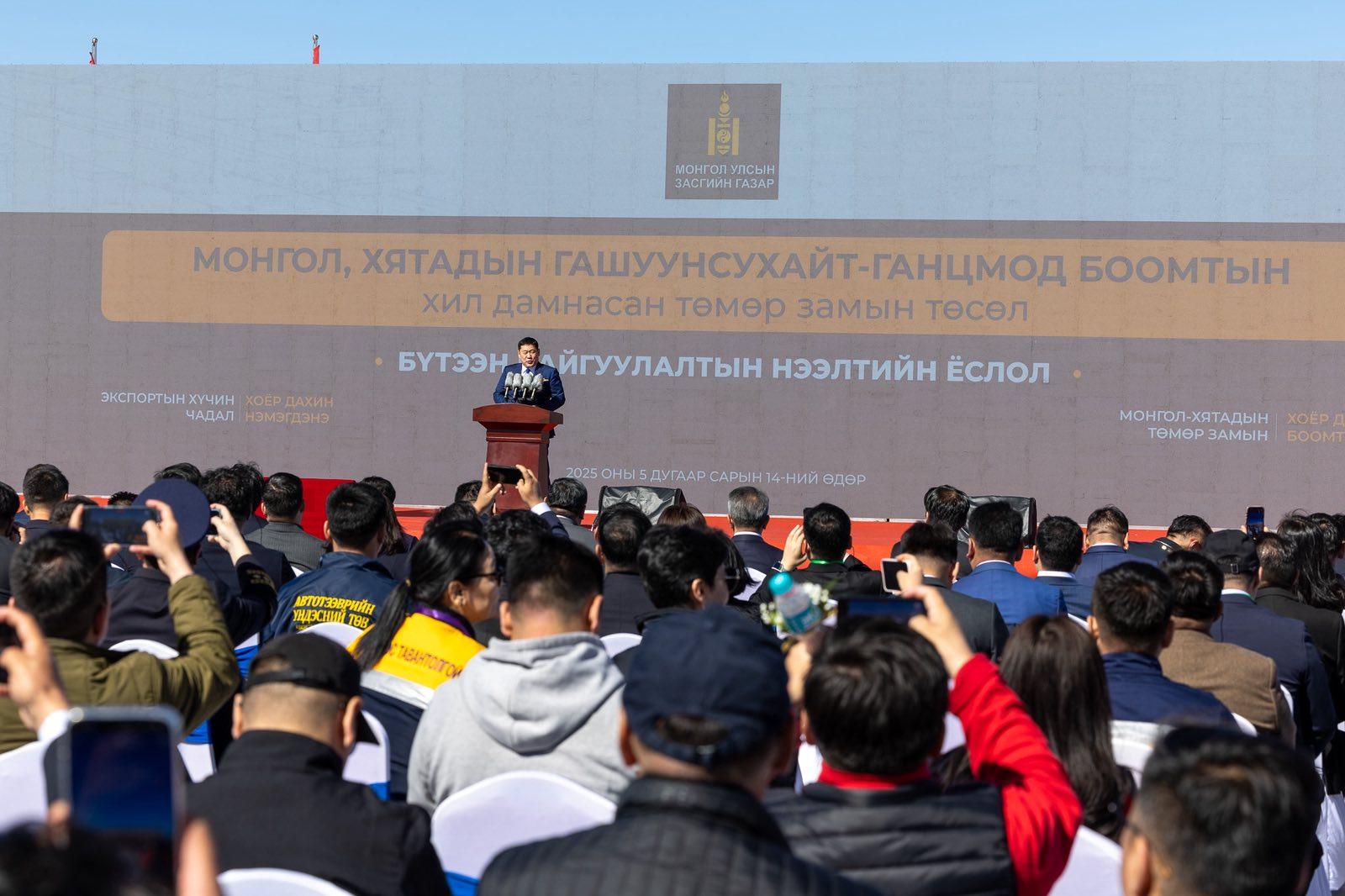 Монгол, Хятадын Гашуусухайт-Ганцмод төмөр замын боомтын хил холболтын бүтээн байгуулалтын нээлт болж байна. Монгол Улсын Ерөнхий сайд Л.Оюун-Эрдэнэ нээлтийн ёслолд оролцож үг хэллээ.