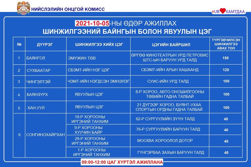 Коронавирусийн дэгдэлт нэмэгдэхтэй зэрэгцээд иргэд PCR шинжилгээнд ихээхэн хамрагдаж байна. Тэгвэл бид танд 9 дүүрэгт байнгын байрлаж ажиллаж байгаа PCR шинжилгээний цэгийн мэдээллийг хүргэж байна. Шинжилгээний цэгүүд 09:00-12:00 цагийн хооронд иргэдээс шинжилгээ авч ажиллаж байна.