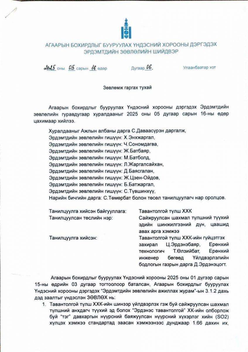 Агаарын бохирдлыг бууруулах Үндэсний хорооны 2025 оны тавдугаар сарын 16-ны өдрийн 4 дүгээр тогтоолоор: