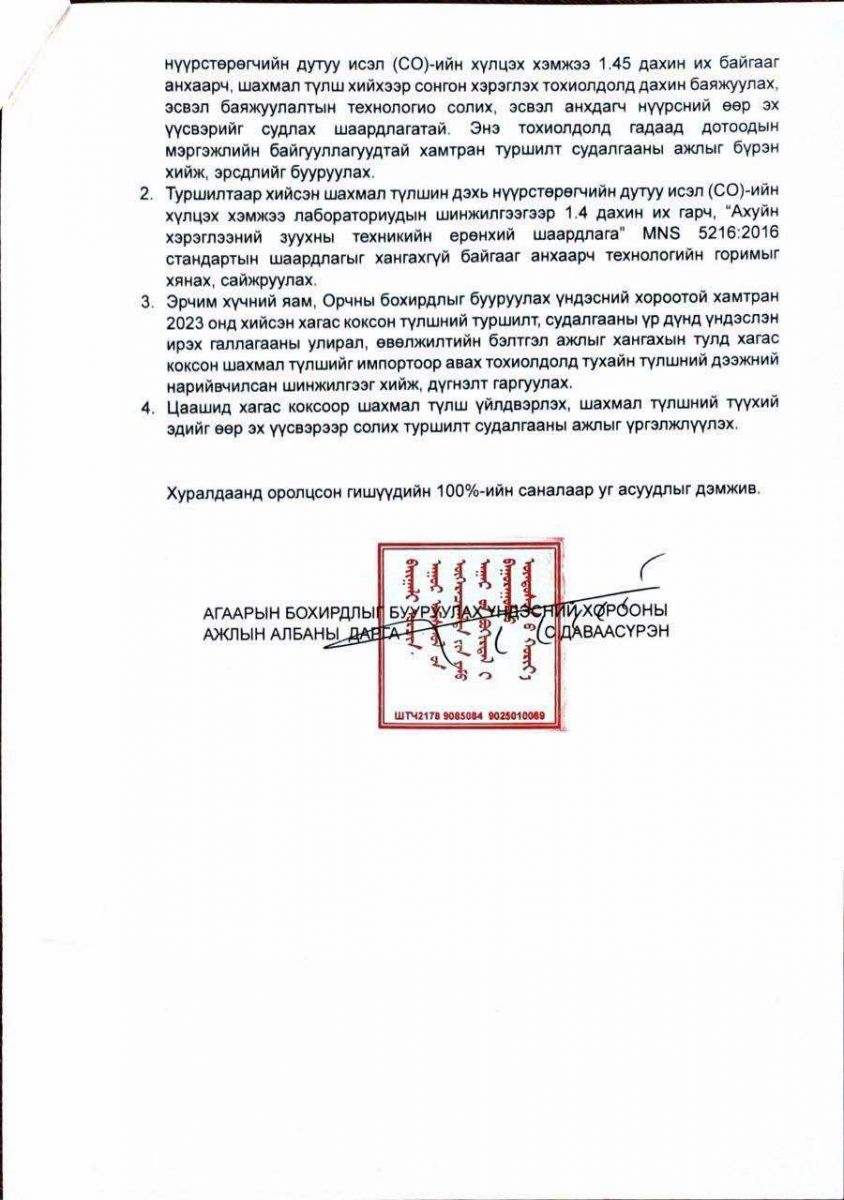 Засгийн газрын 2024 оны 22 дугаар тэмдэглэл болон 2025 оны 2 дугаар тэмдэглэлээр сайжруулсан шахмал түлшний туршилтын ажлыг итгэмжлэгдсэн лабораториудын буюу TTRC, ALS, Ашигт малтмал газрын тосны газар, нийслэлийн Агаар, орчны бохирдолтой тэмцэх газрын лабораторийн шинжилгээнд хүргүүлсэн.