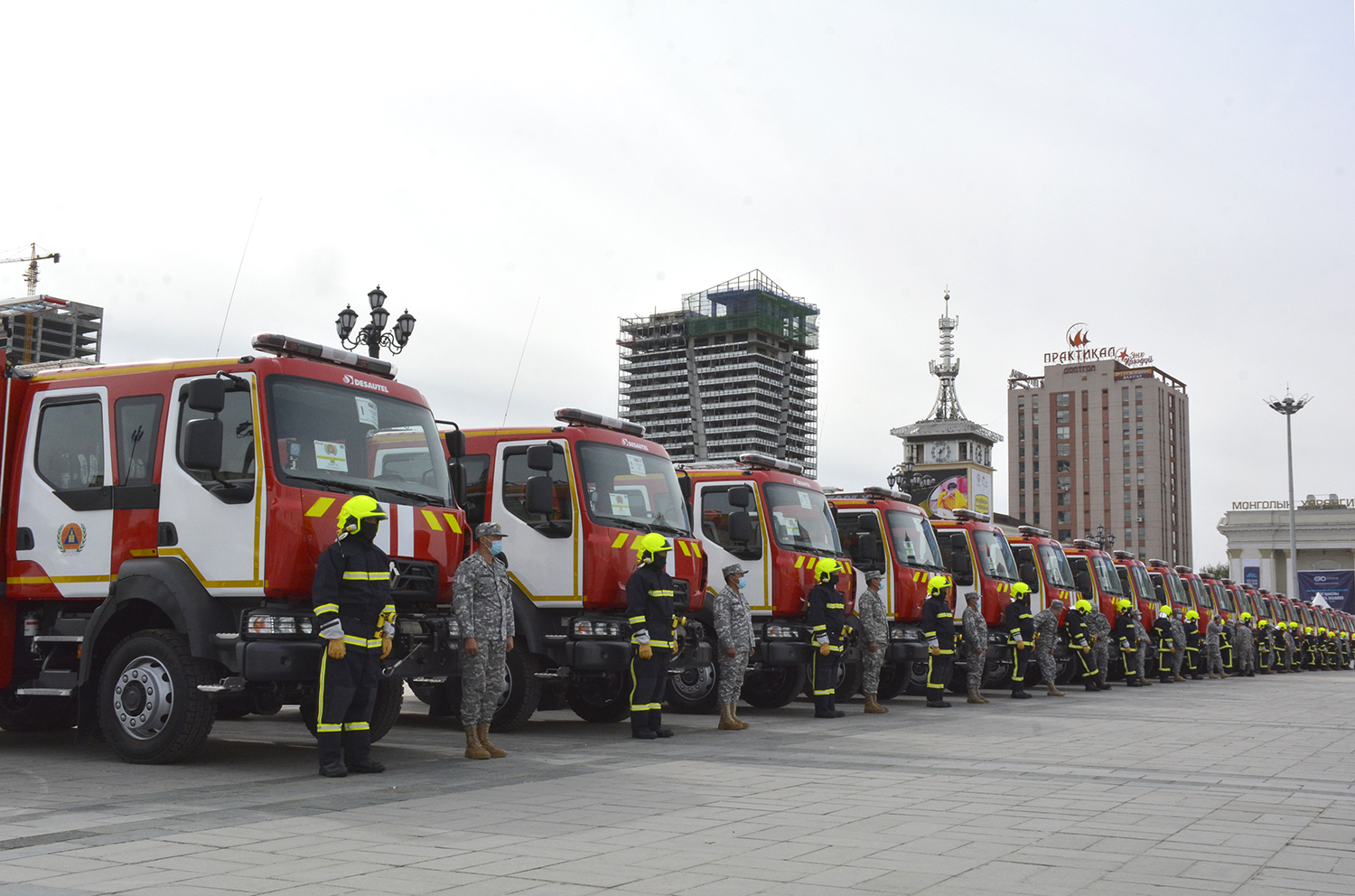 Тэгвэл өнөөдөр эхний ээлжийн хоёр төрлийн 21 гал түймэр унтраах үндсэн албаны автомашиныг хүлээлгэн өгөх арга хэмжээ Д.Сүхбаатарын талбайд боллоо.