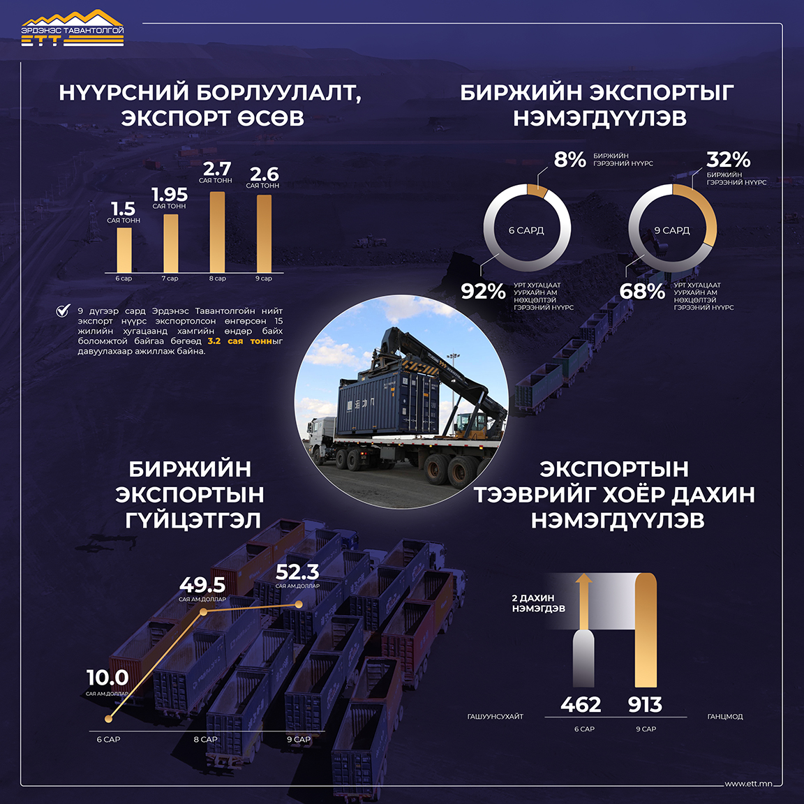 2025 оны 6 дугаар сард биржээр борлуулсан нүүрсний экспорт 8%, урт хугацаат уурхайн ам нөхцөлтэй гэрээний нүүрс 92% байсан бол 9 дүгээр сард биржийн нүүрсний экспорт 32% болж нэмэгдлээ. Өөрөөр хэлбэл 2025 оны 6 сард биржийн экспорт 10 сая ам.долларын гүйцэтгэлтэй байсан бол 8 дугаар сард 49.5 сая ам.доллар, 9 дүгээр сард 52.3 сая ам.доллар болж биржийн экспортын орлого нэмэгдсэн үзүүлэлтэй байна.