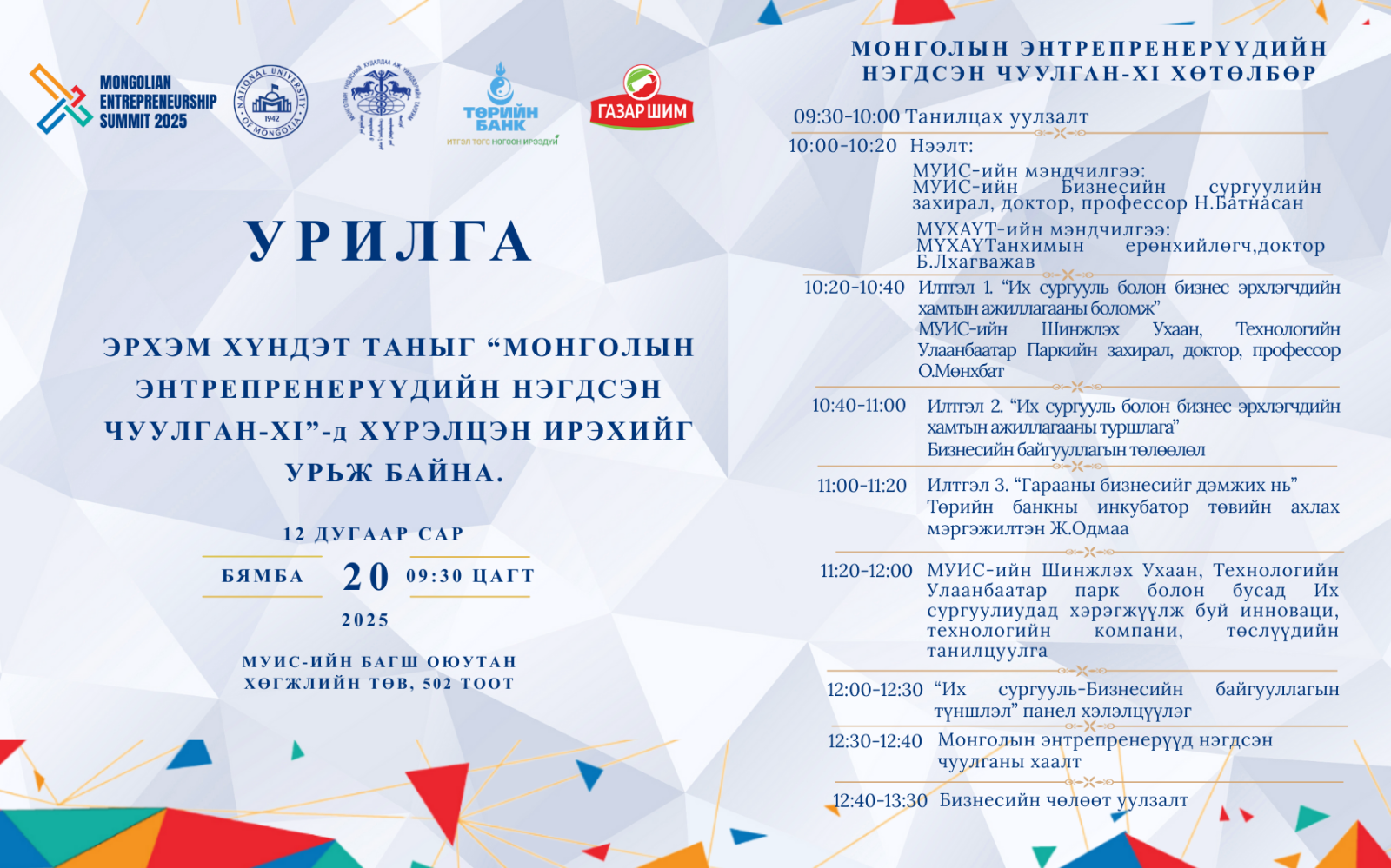 МУИС-ийн Бизнесийн сургуулийн харьяа Бизнес консалтинг төв, Монголын үндэсний худалдаа аж үйлдвэрийн танхим хамтран “Монголын энтрепренерүүдийн нэгдсэн чуулган - 2025” арга хэмжээг энэ сарын 20-ны өдөр МУИС-ийн Багш, оюутны хөгжлийн төвд зохион байгуулах гэж байна.