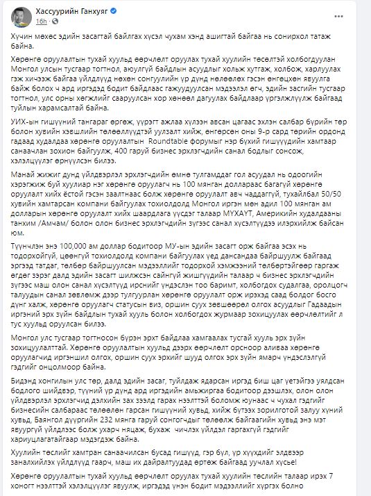 Хөрөнгө оруулалтын тухай хуульд өөрчлөлт оруулах тухай хуулийн төсөлтэй холбогдуулан шүүмжлэл өрнөж буй энэ үед УИХ-ын гишүүн Х.Ганхуяг дараах тайлбар хийжээ. Тэрбээр.