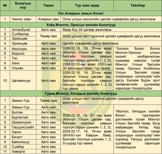Хилийн боомтуудын 2026 оны хоёрдугаар сард ажиллах болон түр хаах өдрүүдийг Хил хамгаалах яамнаас мэдээллээ.