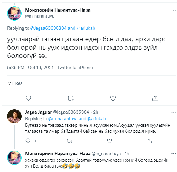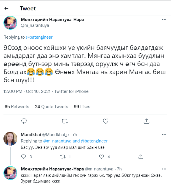 – Нэгэнт Болдын тухай ам нээснийх дахиад хэлчмээр нэг бодол байна. Хэн мөнгөтэй бн түүнийг тархидаад сурцан гаршдээ үнэндээ! Нээх төсөл мөсөл гэж шаагаад, үнэндээ ар хударгаар юугаараа яаж нэгддэг нь сонин. 20 оны сонгуулиар ичихгүй Пунсалмаагаас хэдэн юм салгацан охидын төлөө… төсөл мөсөл гээд гарч ирэхэд хөх инээд хүрч бсн шүү. Өнөө төсөл хаачсан таг ийм л я н х а н ш д