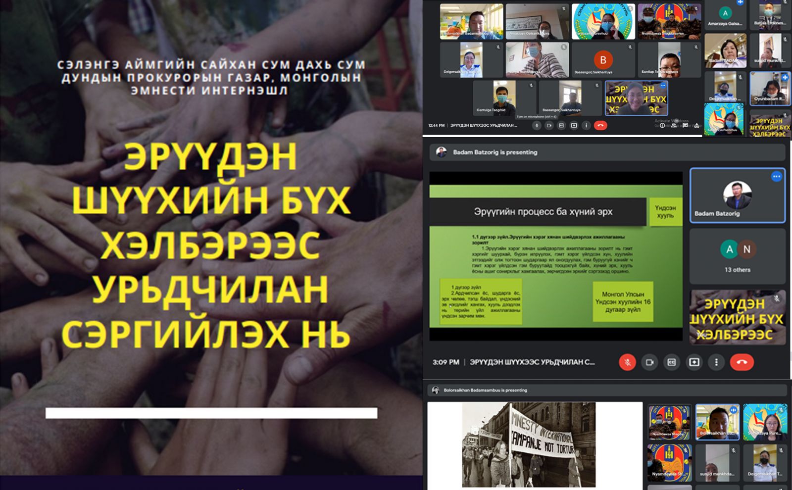 Сэлэнгэ аймгийн Сайхан сум дахь сум дундын прокурорын газраас Монголын эмнести интернэшнл байгууллагатай хамтран “Эрүүдэн шүүхийн бүх хэлбэрээс урьдчилан сэргийлэх, ангид байх нь” сэдэвт сургалт, зөвлөгөөнийг цахим хэлбэрээр зохион байгуулсан байна.