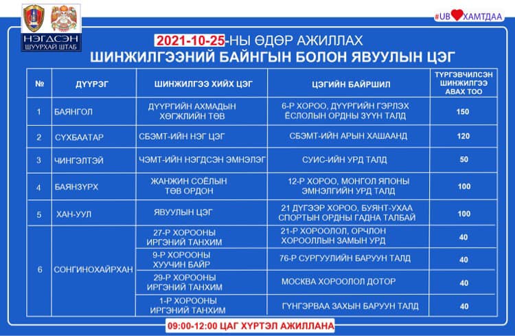 Нийслэлд сүүлийн өдрүүдэд цар тахлын тоо өсөж буйтай холбогдуулан иргэд олноор PCR шинжилгээнд ихээхэн хамрагдаж болжээ. Өнөөдрийн байдлаар нийслэлийн 6 дүүрэгт байнгын болон явуулын цэгүүд иргэд олон нийтэд үйлчилж байна. Тодруулбал, PCR шинжилгээний тоог зарим дүүргүүдэд нэмэгдэлтэй авч байна. Үүнд, БГД-т 150 сорьц, СБД-т 120 сорьц гэх мэтээр иргэдээс сорьц авахаар ажиллаж байна.