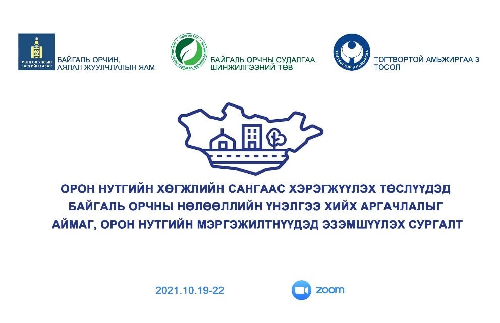 Байгаль орчин, аялал жуулчлалын яам, “Байгаль орчны, судалгаа шинжилгээний төв” УТҮГ, Тогтвортой амьжиргаа-3 төсөл хамтран Орон нутгийг хөгжүүлэх сангаас хэрэгжүүлэх төслийн үйл ажиллагаанд Байгаль орчны нөлөөллийн үнэлгээ хийх, түүнтэй холбогдох эрх зүйн зохицуулалт, орон нутагт анхаарах асуудал, шийдвэрлэх арга зам болон сум, дүүрэгт ажиллаж буй албан хаагчдад байгаль орчныг хамгаалах тухай хууль тогтоомжийг хэрэгжүүлэхэд дэмжлэг үзүүлэх, чадавх бэхжүүлэх сургалтыг 2021 оны 10 дугаар сарын 19-нөөс 10 дугаар сарын 22-ны өдрүүдэд цахимаар амжилттай зохион байгууллаа.