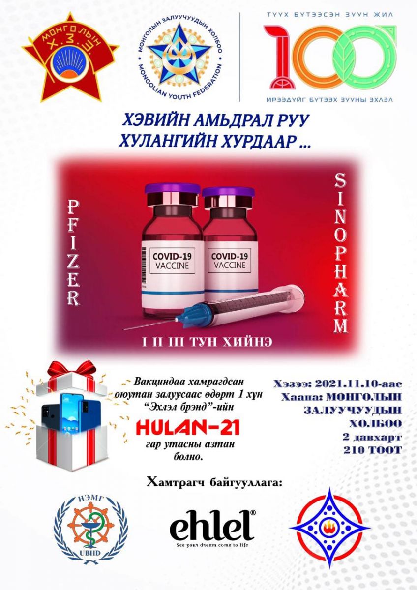 Ингэхдээ дархлаажуулалтын үндсэн дээр бидний өдөр тутмын амьдрал хэвийн үргэлжлэх боломжтой гэдэг нэгдмэл ойлголтод хүрээд байна. Манай улсын хувьд үүнтэй маргах хүн цөөн ч сүүлийн үед залуучуудын идэвх харьцангуй бага үзүүлэлттэй байгаа юм. Тиймээс Монгол залуучуудынхаа дархлааг дэмжихээр Монголын залуучуудын холбооноос урамшуулалт үйл ажиллагааг зохион байгуулахаар боллоо. Тодруулбал, 2021 оны арваннэгдүгээр сарын 10-ны өдрөөс МЗХ-ны байранд дархлаажуулалтын цэг ажиллуулж, тухайн цэгт вакцин хийлгэсэн оюутан залуучуудаас өдөр бүр нэг азтаныг тодруулан “Эхлэл брэнд”-ийн HULAN-21 гар утсаар урамшуулах болно.