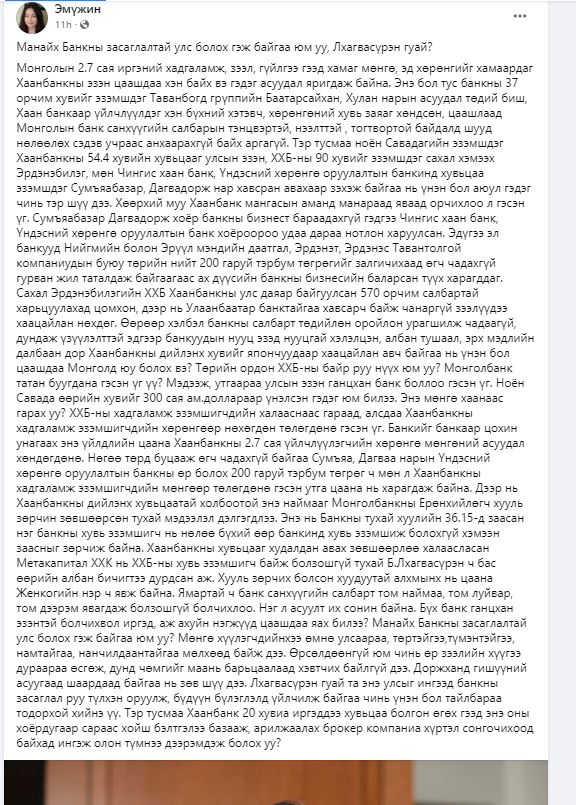 Ямартай ч банк санхүүгийн салбарт том наймаа, том луйвар, том дээрэм явагдаж болзошгүй болчихлоо. Нэг л асуулт их сонин байна. Бүх банк ганцхан эзэнтэй болчихвол иргэд, аж ахуйн нэгжүүд цаашдаа яах билээ? Манайх Банкны засаглалтай улс болох гэж байгаа юм уу? Мөнгө хүүлэгчдийнхээ өмнө улсаараа, төртэйгээ,түмэнтэйгээ, намтайгаа, нанчилдаантайгаа мөлхөөд байж дээ. Өрсөлдөөнгүй юм чинь өр зээлийн хүүгээ дураараа өсгөж, дунд чөмгийг маань барьцаалаад хэвтчих байлгүй дээ. Доржханд гишүүний асуугаад шаардаад байгаа нь зөв шүү дээ. Лхагвасүрэн гуай та энэ улсыг ингээд банкны засаглал руу түлхэн оруулж, бүдүүн бүлэглэлд үйлчилж байгаа чинь үнэн бол тайлбараа тодорхой хийнэ үү. Тэр тусмаа Хаанбанк 20 хувиа иргэддээ хувьцаа болгон өгөх гээд энэ оны хоёрдугаар сараас хойш бэлтгэлээ базааж, арилжаалах брокер компаниа хүртэл сонгочихоод байхад ингэж олон түмнээ дээрэмдэж болох уу?
