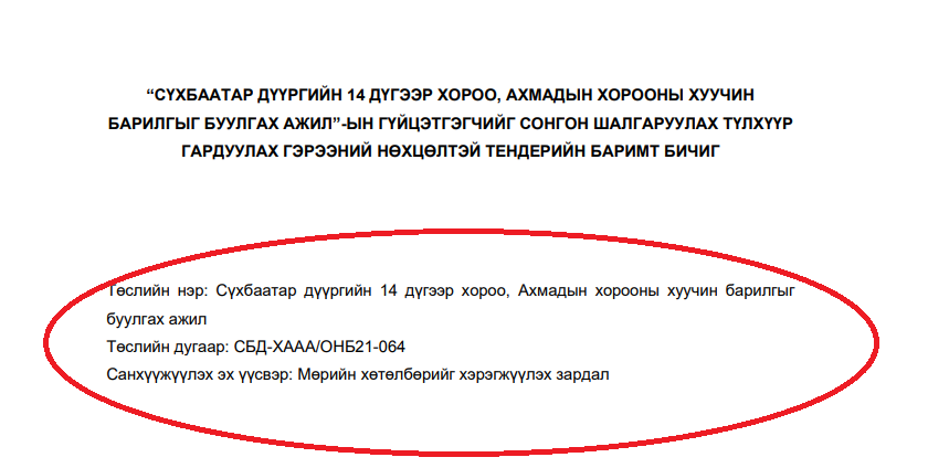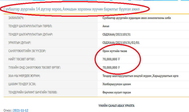 Харин үүнтэй ижил төстэй арга барилаар Сүхбаатар дүүргийн тамгын газрын захиалгаар тус дүүргийн 14-р хорооны “Ахмадын хороо”-ны хуучин барилгыг нураах тендерийг 11 сарын 12-ны өдөр зарлаад байна. Уг нураах ажиллагааны зардал нь орон нутгийн төсвөөс гарах бөгөөд 70 сая төгрөгийн санхүүжилттэй. Тендерийн материалыг 11 сарын 29-ний өдрийн 19:30 минутад хүлээн авахаар тооцоолжээ.