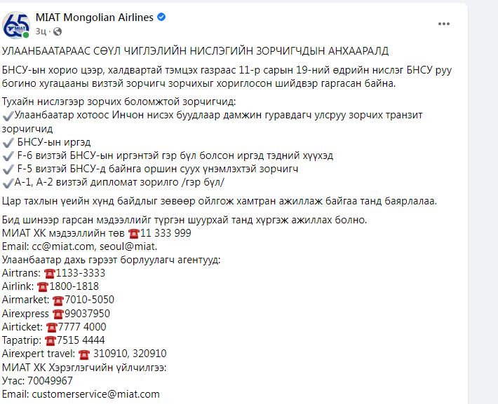 БНСУ богино хугацаааны визтэй иргэдийг хүлээн авахаас татгалжээ. Тодруулбал, Улаанбаатар-Сөүл чиглэлийн зорчигчдоос Ковид-19 халдварын тохиолдол олон батлагдсан билээ. Энэ сарын 2-ны нислэгээр “БНСУ-руу нислэг үйлддэг бүх агаарын тээвэрлэгчдэд мөрдүүлэх заавар”-ын дагуу Улаанбаатар-Сөүл чиглэлд Сөүл хотод буух зорчигч тээвэрлэхгүй байх шийдвэр гаргасан байна. Тэгвэл дээрх шийдвэр үргэлжилсээр байна. Энэ сарын 19-ний өдрийн нислэгээр хугацааны визтэй зорчигч зорчихыг хоригложээ.