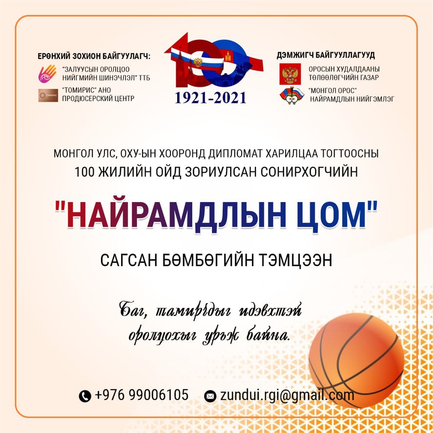 Монгол улс Оросын холбооны улсын хооронд дипломат харилцаа тогтоосны 100 жилийн ойн хүрээнд Залуусын Оролцоо Нийгмийн Шинэчлэл ТТБ, Найрамдлын Нийгэмлэг, ОХУ-ын Томирис байгууллагтай хамтран "Найрамдлын цом" сонирхогчдын сагсан бөмбөгийн тэмцээн зохион байгуулж байна. Тэмцээн 12 дугаар сарын 04-05-ны өдрүүдэд болох бөгөөд баг тамирчдыг идэвхтэй оролцохыг урьж байна.
